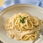 파스타 접시에 파스타면을 돌돌 돌려 담아주면 완성! 취향에 따라 후추와 치즈, 파슬리를 뿌려주세요.