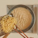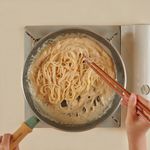 팬에 크림 파스타소스를 넣어준 후, 소스가 부글부글 끓을 때 삶은 면을 넣어 주세요. 면에 소스가 잘 묻어 나올 때까지 섞어주면 완성!