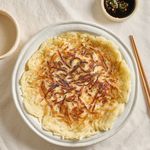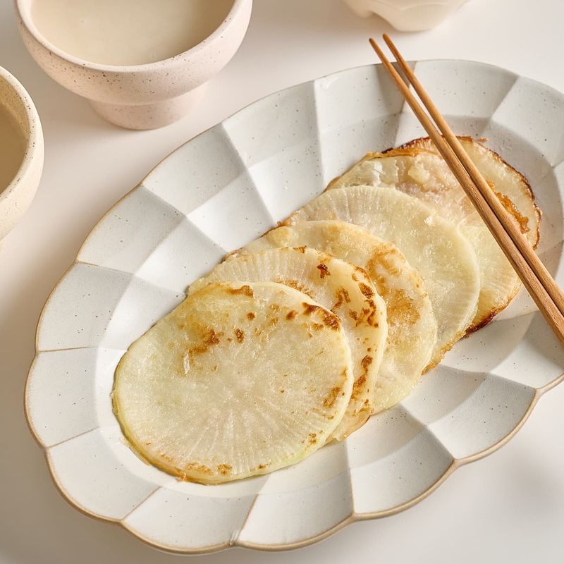 껍질을 제거한 무는 0.5cm 두께로 얇게 원형 썰기해 주세요. 연두순(1.5스푼, 15g)을 넣고 5분간 절여주고, 튀김가루(1컵, 100g)에 물(8스푼, 80g)을 섞어 반죽을 만들어 절인 무와 함께 섞어주세요. 중불로 예열한 팬에 식용유를 두르고, 무를 하나씩 올려 앞뒤 30초씩 노릇하게 구워주면 완성!