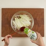 무는 흐르는 물에 겉면을 깨끗하게 씻은 후, 필러로 껍질을 제거하고 0.2cm 두께로 얇게 원형 썰기해 주세요. 썰은 무를 몇 장 겹쳐 다시 얇게 채 썰어주세요.