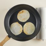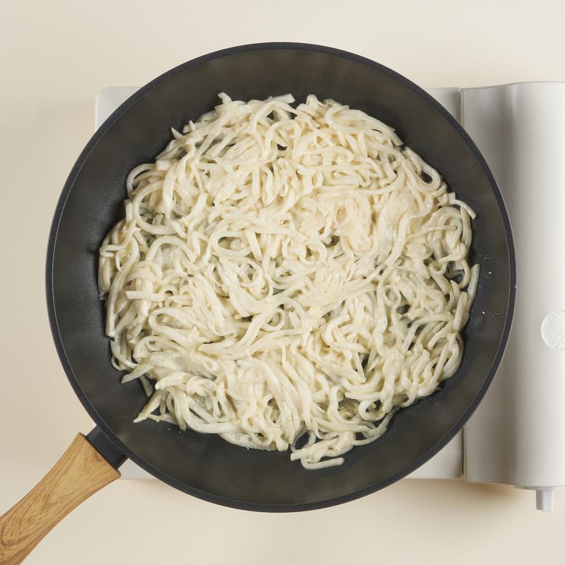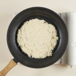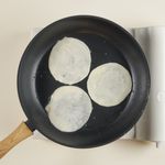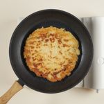 중불로 예열한 팬에 식용유를 두르고 반죽을 얇게 펴 주세요. 뒷면이 노릇해진 상태일 때 뒤집어 반대편도 노릇노릇하게 부쳐주면 완성! (한 면 당 약 30초씩)