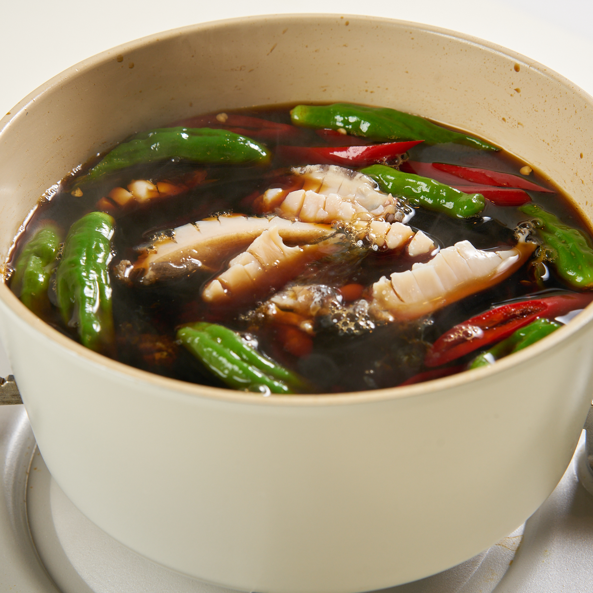 냄비에 물(2.5컵), 새미네 진간장, 설탕, 꽈리고추, 홍고추, 생강, 마늘을 모두 넣고 센 불에서 끓여주세요. 물이 끓어오르고 거품이 일면, 거품을 제거하고 약불로 줄여 5분간 끓여주세요.