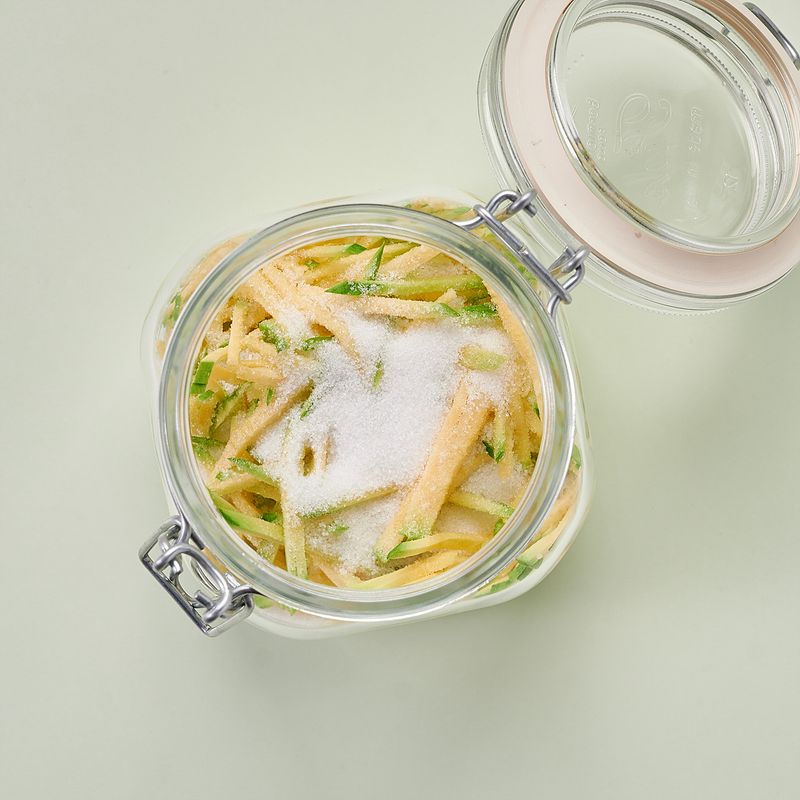 썰어둔 애호박과 설탕을 잘 섞어준 뒤, 1주일 냉장보관하여 당절임해 주세요.