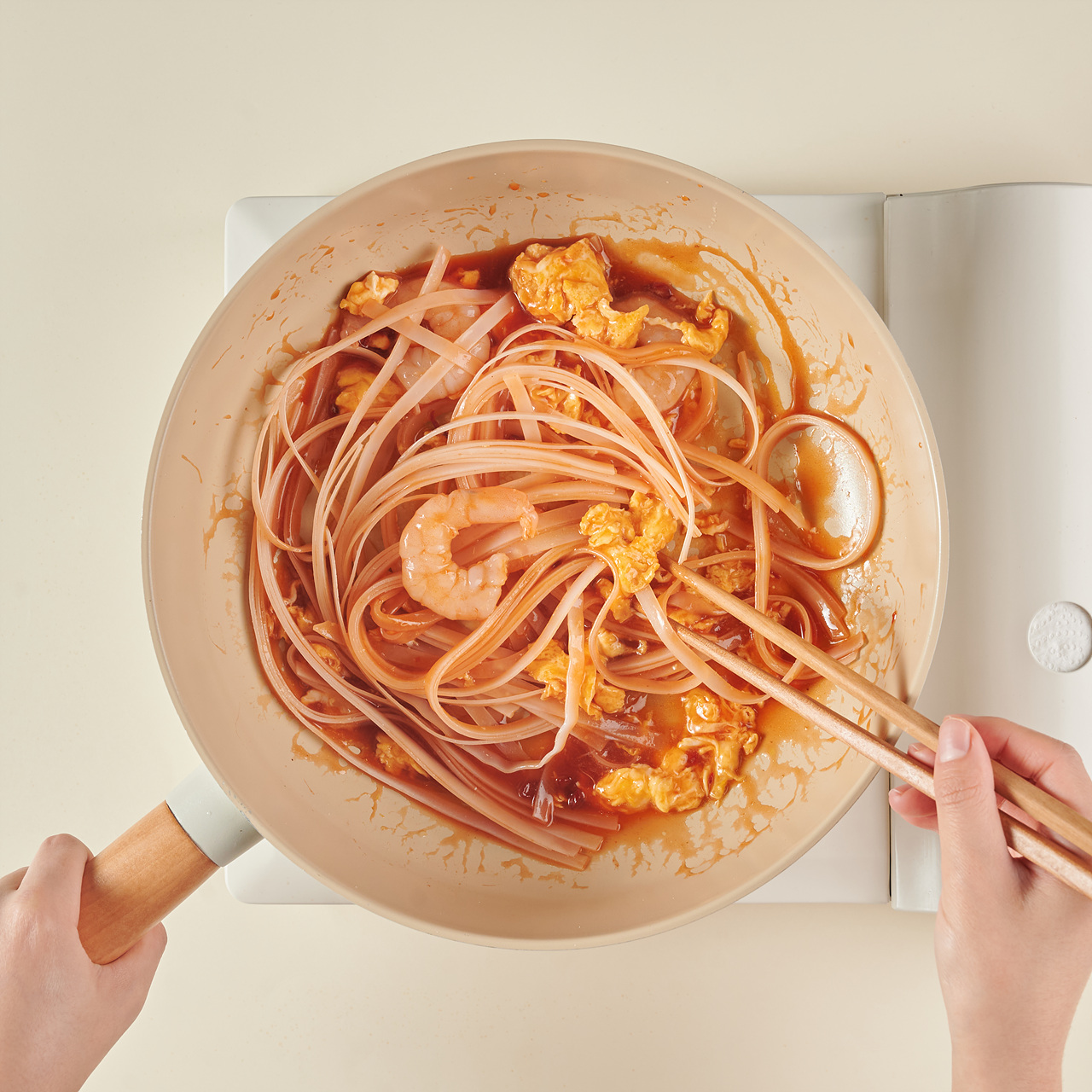 중불의 같은 팬에 새우를 넣고 1분 동안 볶은 다음, 팟타이 소스를 넣고 소스가 끓기 시작하면 불린 면을 넣어 1~2분간 졸이듯이 볶아주세요.