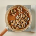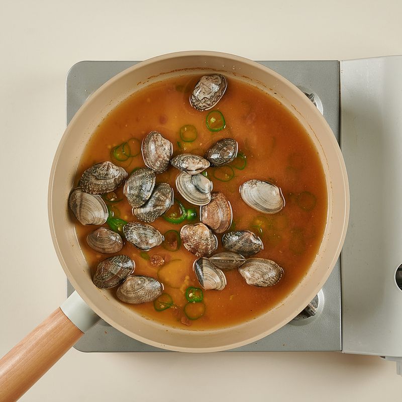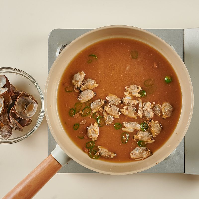 팬에 물, 된장(토장), 다진 청양고추, 해감된 바지락을 넣고 바지락의 입이 거의 다 열릴 때까지 센불에서 끓여주세요.