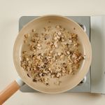 센불로 예열한 팬에 식용유를 두른 후, 1~2분간 양파를 노릇하게 볶아주다가 느타리버섯을 넣고 중불에서 2분간 더 볶아주세요.