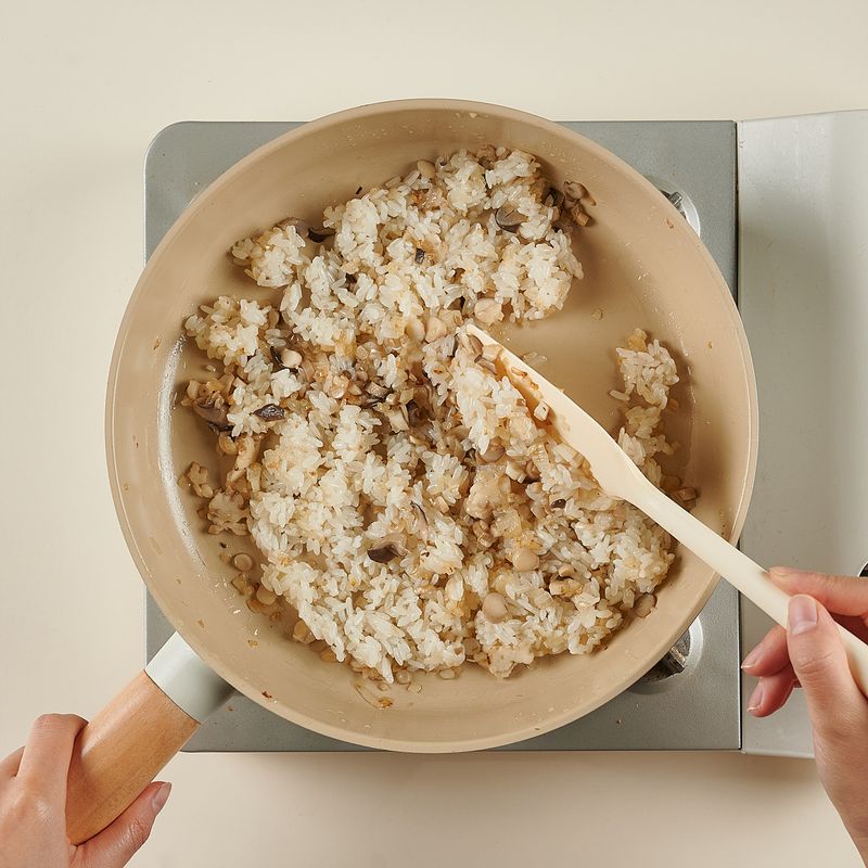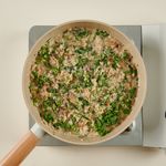 볶은 재료 위에 밥(1/2공기, 100g)을 넣어 센불에서 1분간 고슬고슬하게 볶은 후, 만들어 둔 바지락 된장 크림소스를 2~3번에 나누어 부어가며 계속 볶아주세요.