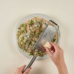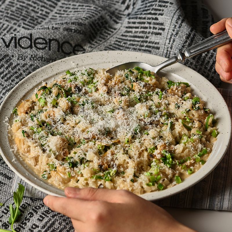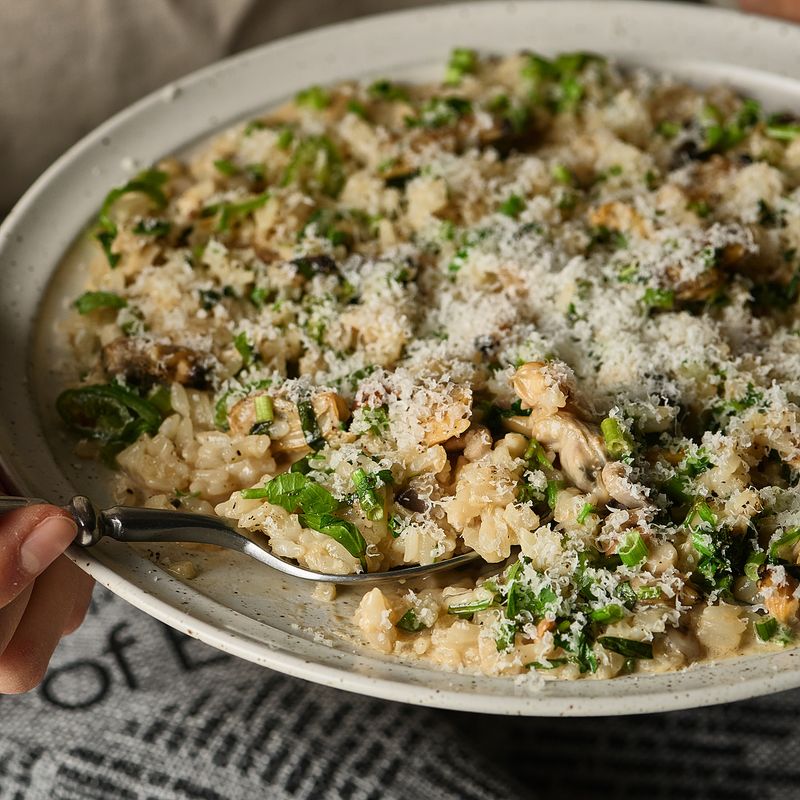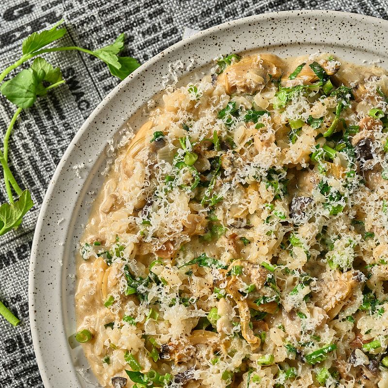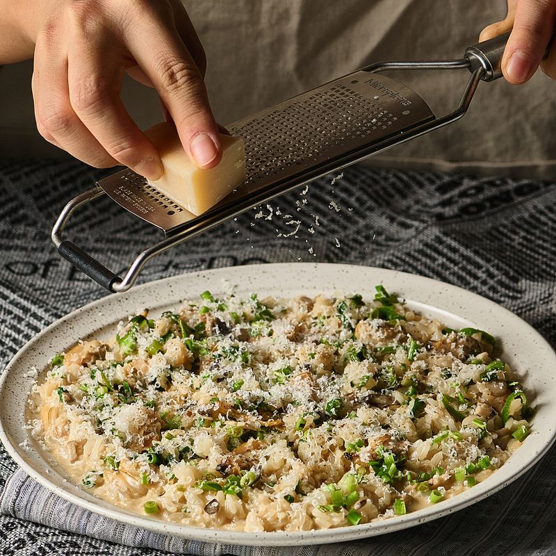 마지막으로 리조또 위에 손질한 미나리와 후추, 그라노파다노 치즈를 뿌려주면 완성!