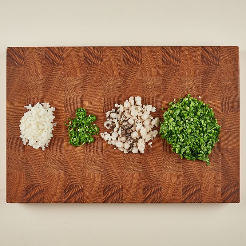 양파는 사방 0.5cm로 다져주고 미나리, 청양고추, 느타리버섯은 0.5cm 두께로 송송 썰어주세요.