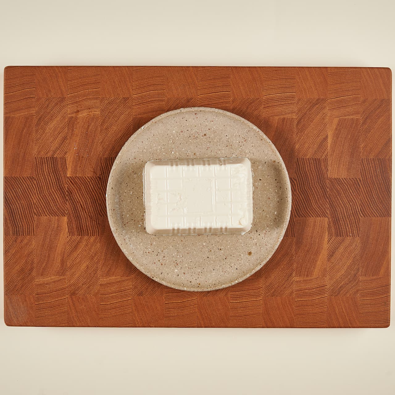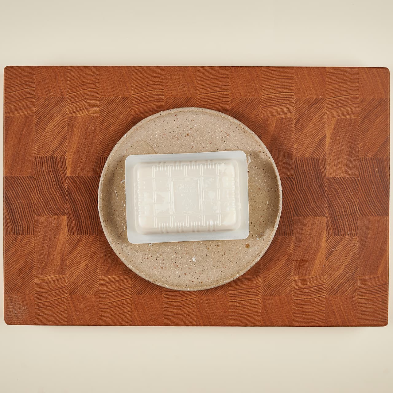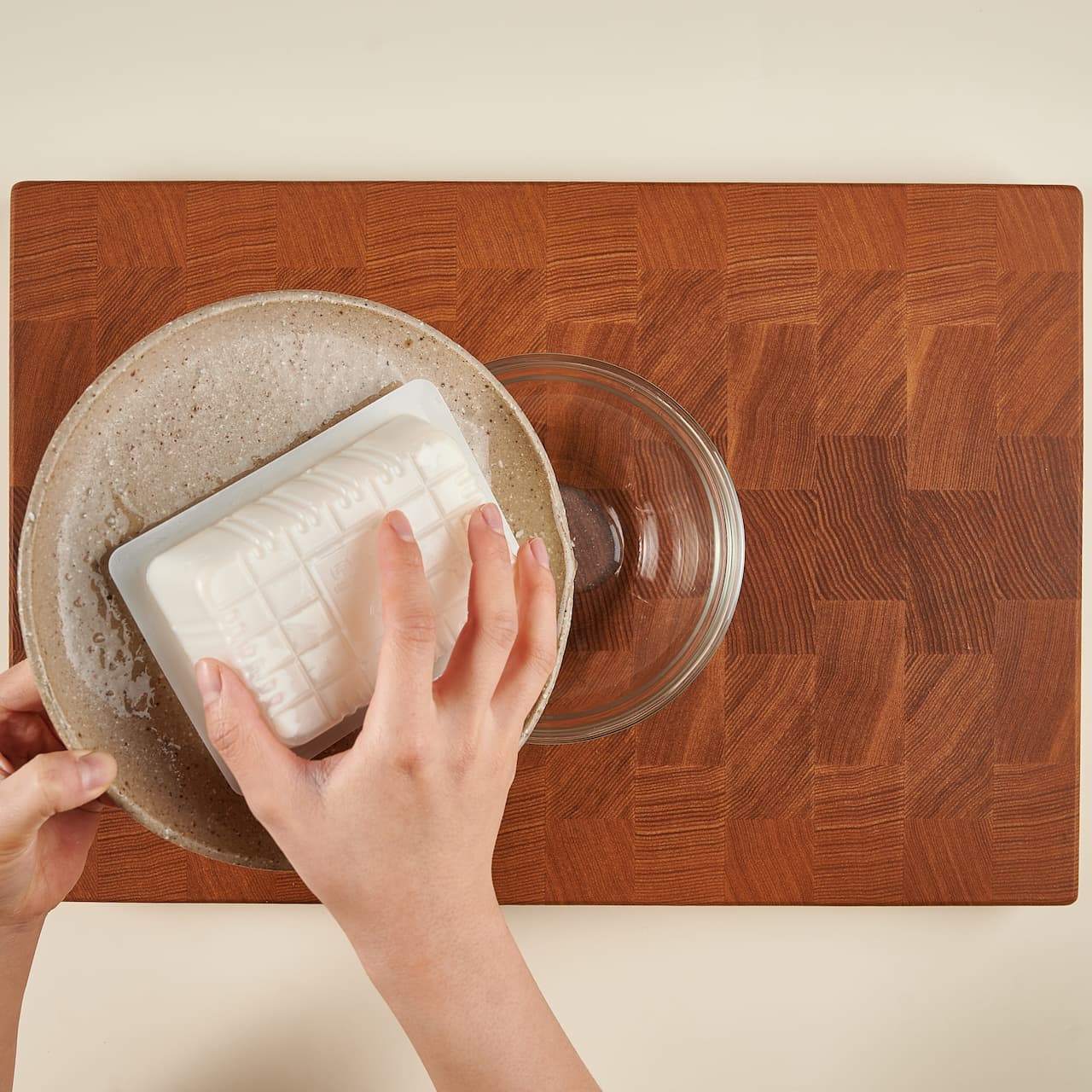 연두부는 접시에 바로 담아 뒤집어 올리고, 접시를 기울여 두부의 수분을 제거해 주세요.