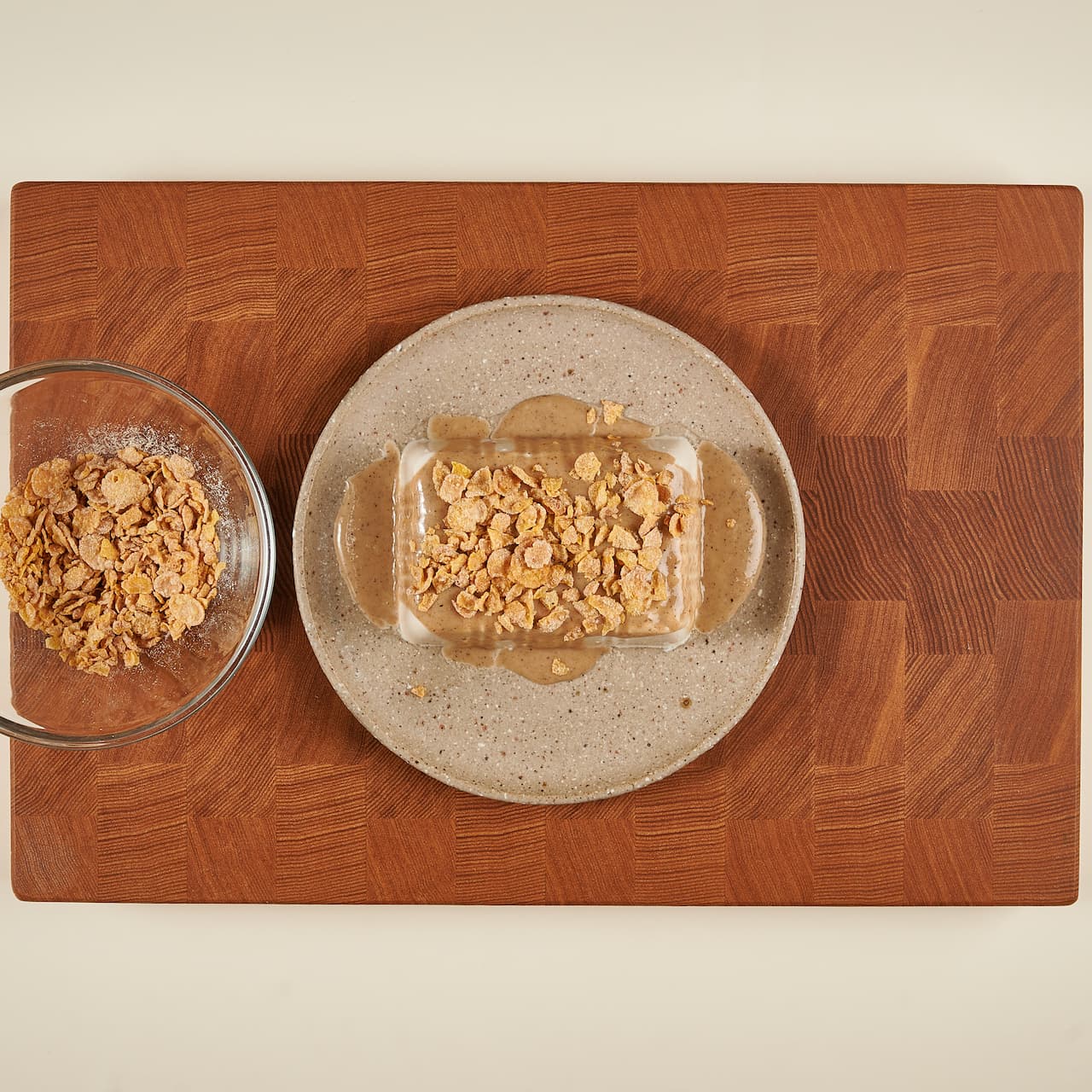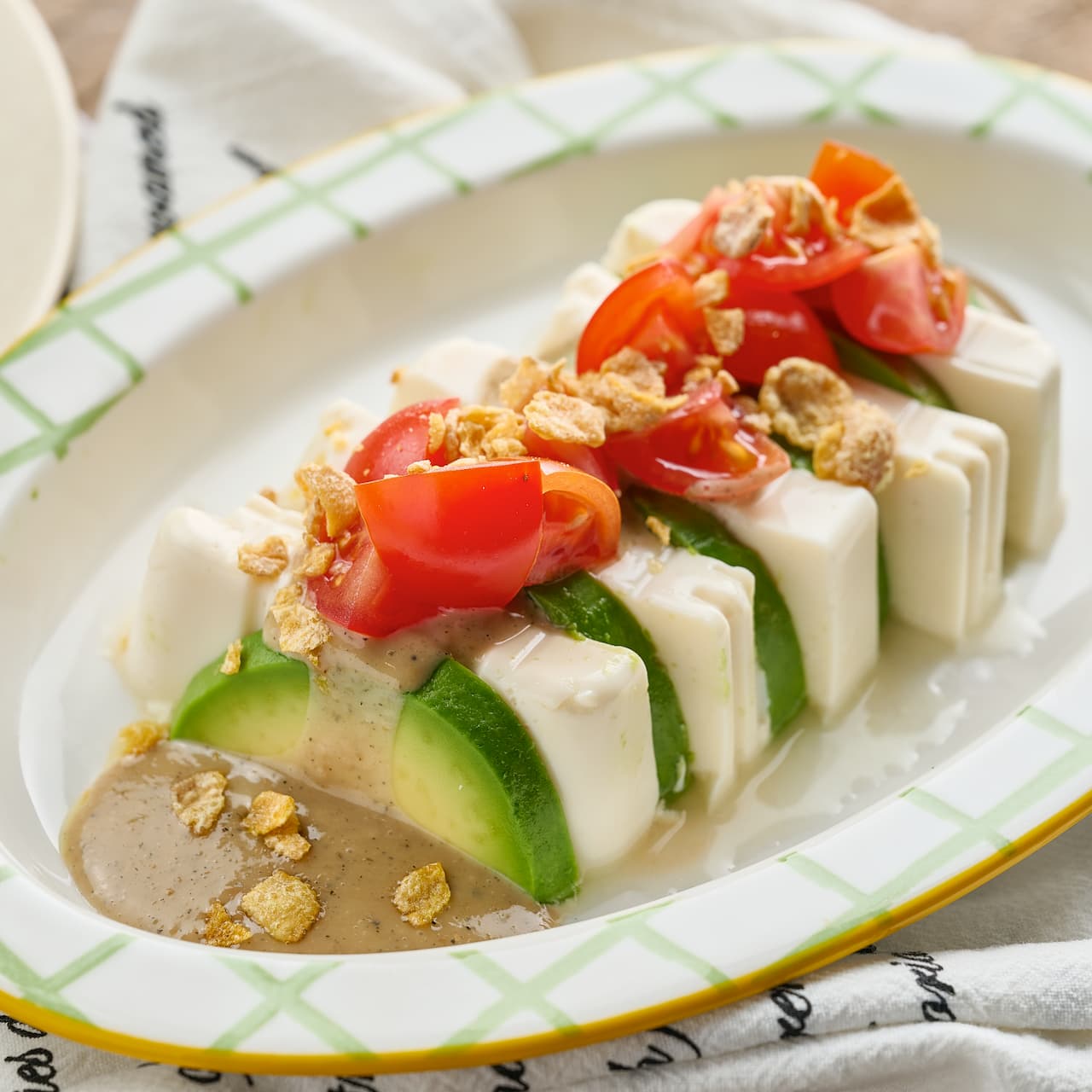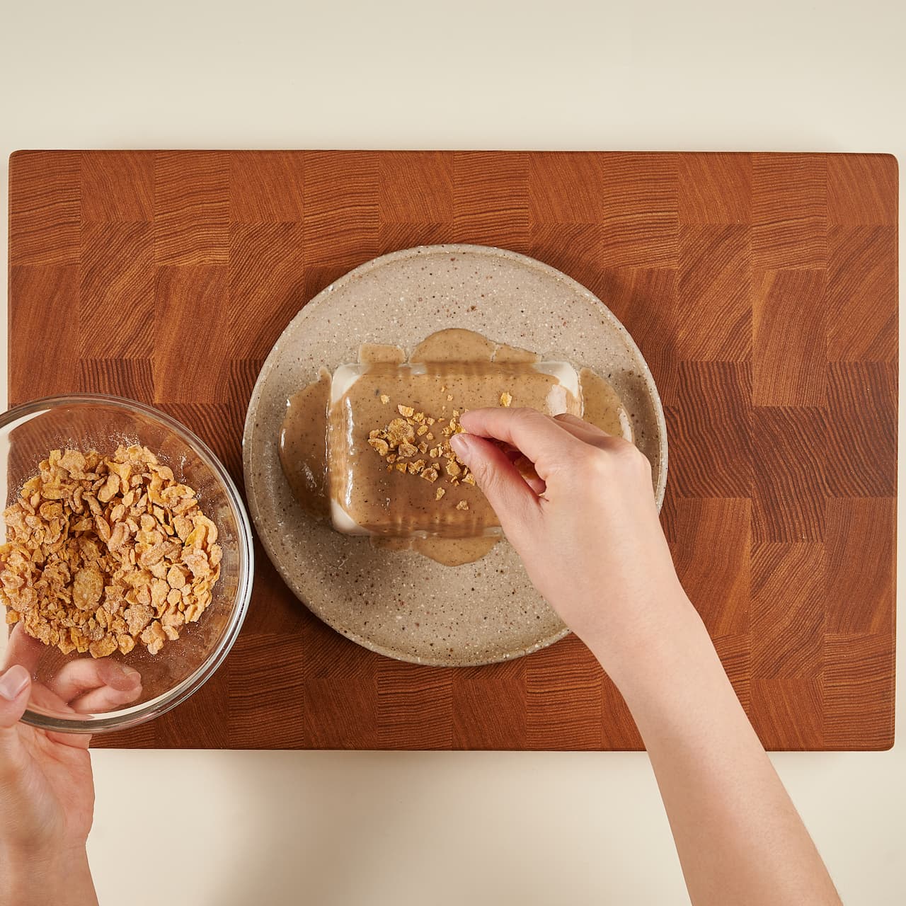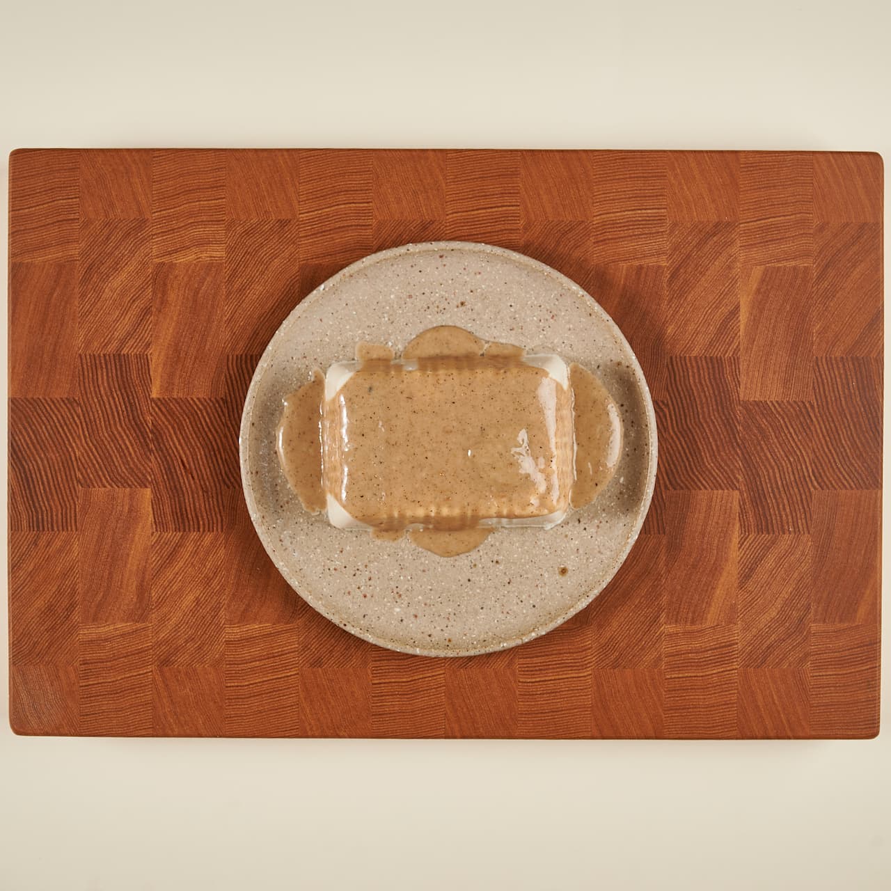 연두부는 접시에 바로 담아 뒤집어 올리고, 접시를 기울여 두부의 수분을 제거해 주세요.