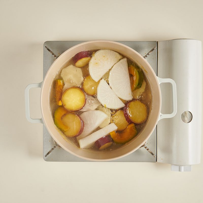 Step 4. 무, 감자, 고구마, 단호박 끓이기