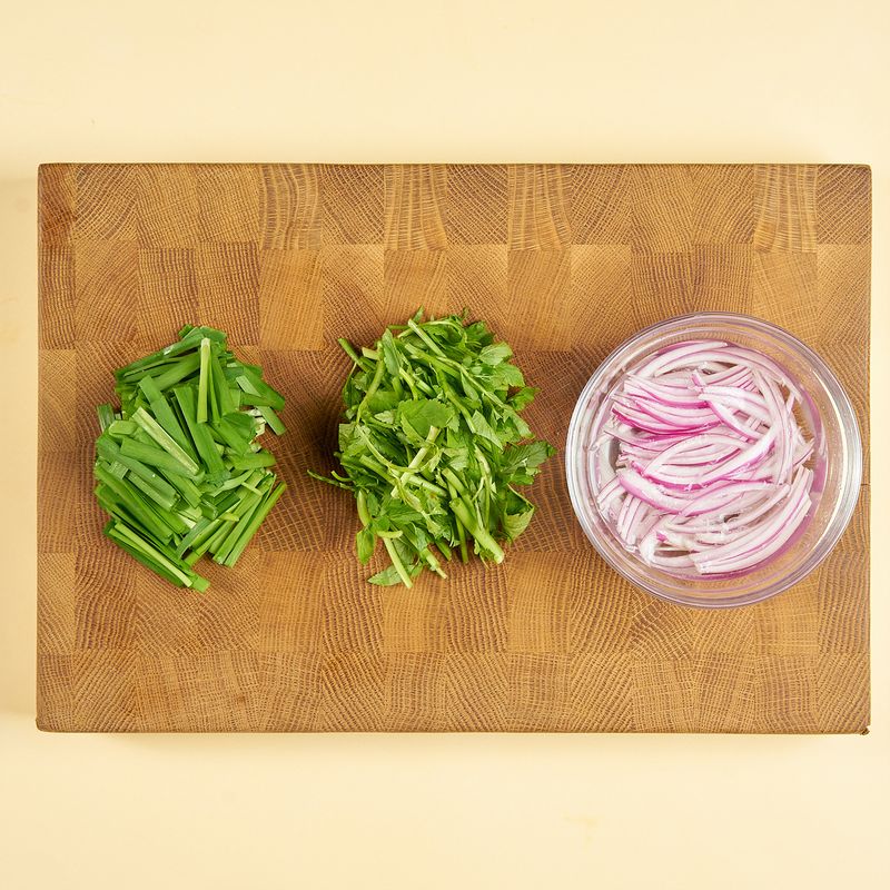 부추와 미나리는 흐르는 물에 씻어 흙을 제거하고, 3~4cm 길이로 썰어 주세요. 적양파는 얇게 채 썰어 찬물에 담궈 매운맛을 제거해 주세요.