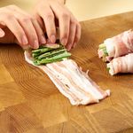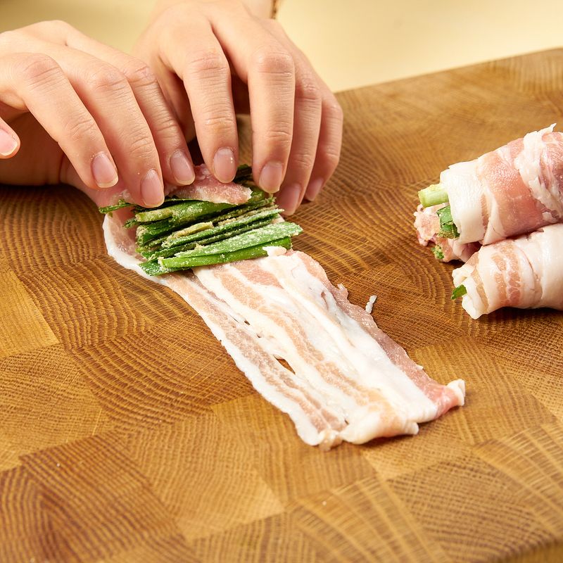 재워 두었던 대패삼겹살을 2~3장 겹쳐 놓은 뒤, 양념한 부추를 넣고 돌돌 말아주세요.