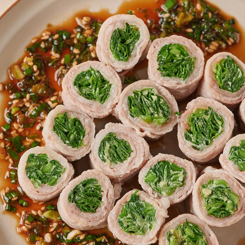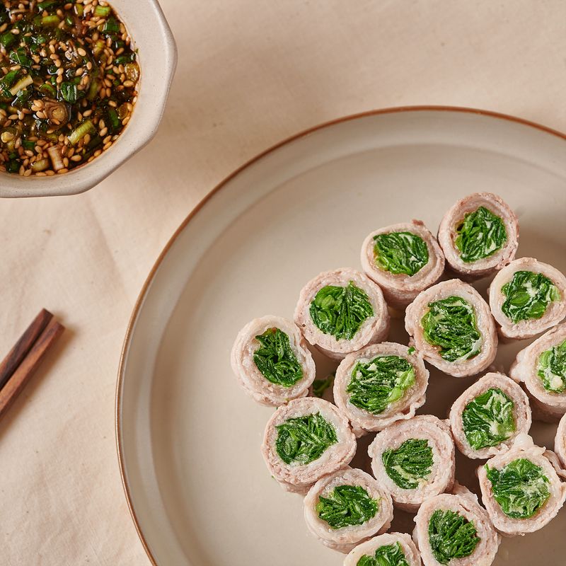 콩가루와 양념에 버무린 부추를 삼겹살 안에 넣고 말아주면 완성!아삭하고 부드러운 식감을 한 번에 느껴보세요!