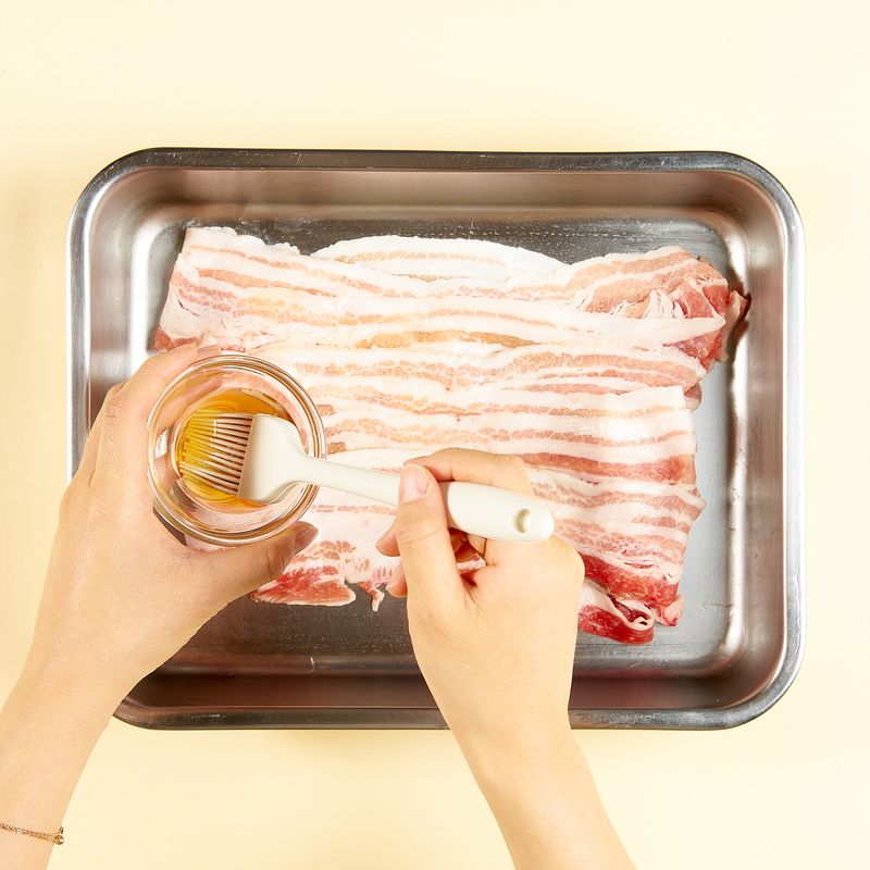 대패삼겹살에 연두진 1.5스푼을 발라, 밑간이 되도록 15분간 재워 주세요.