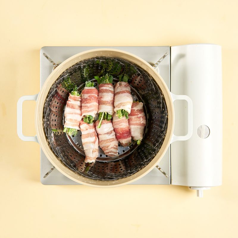 분량의 물과 소주를 섞어 찜기의 물로 넣어주고, 센불에서 먼저 끓여주세요. 김이 올라오면 중불로 낮춘 후, 준비한 대패삼겹말이를 찜기 위에 올려 25분간 쪄주세요.