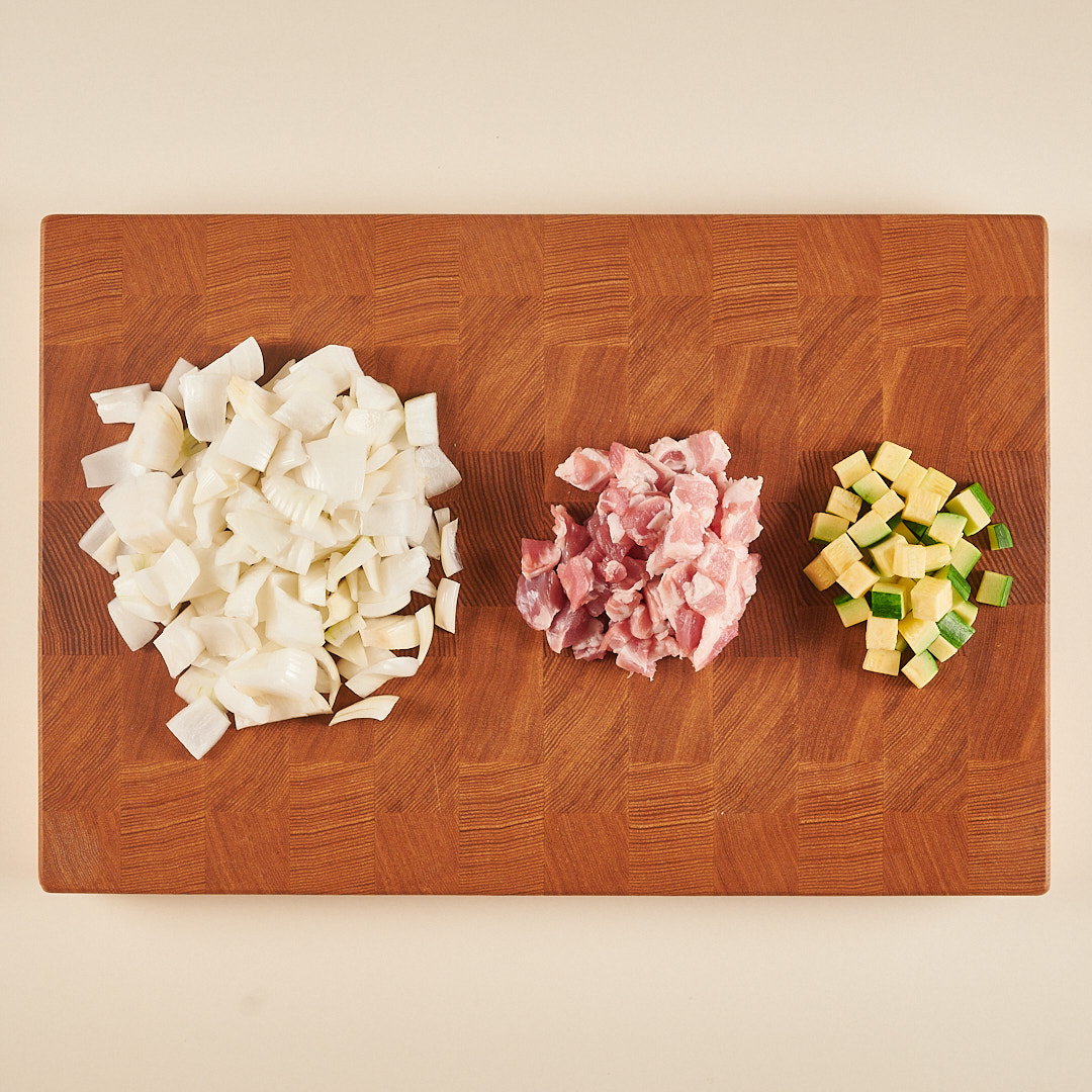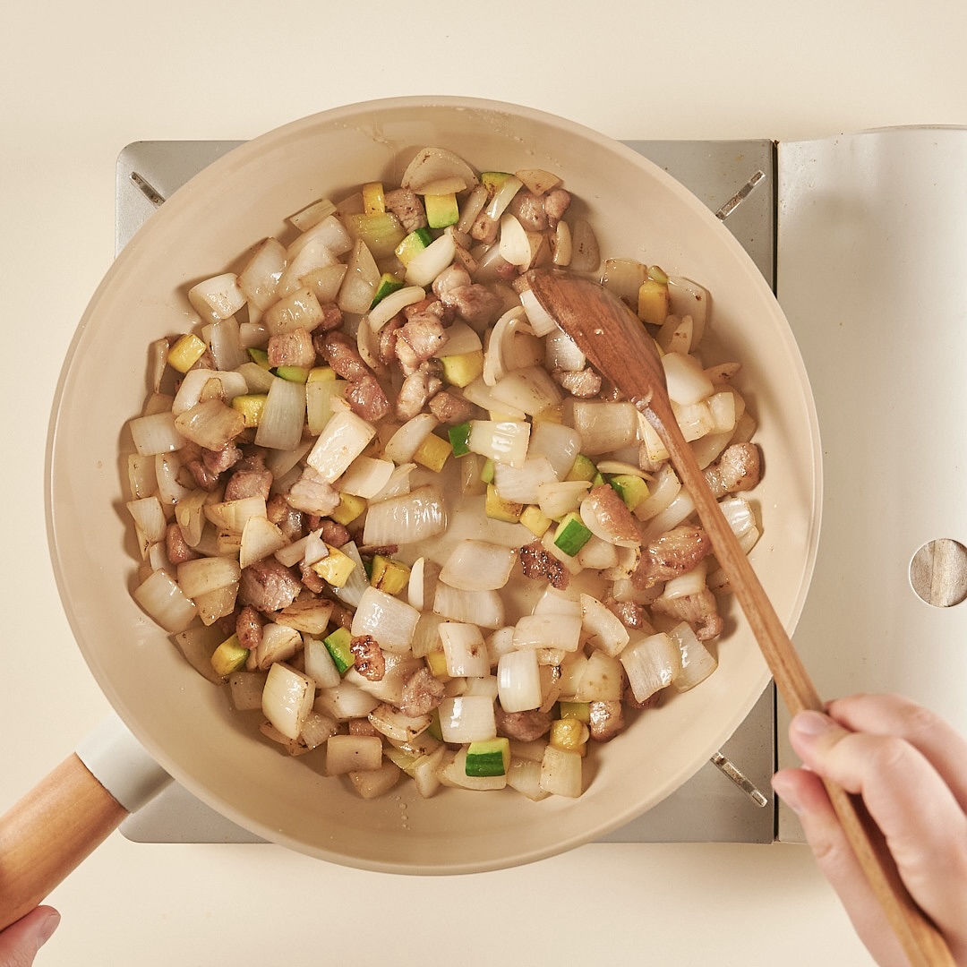 돼지고기, 양파, 애호박은 2cm 크기로 깍둑 썰어 준비해 주세요.