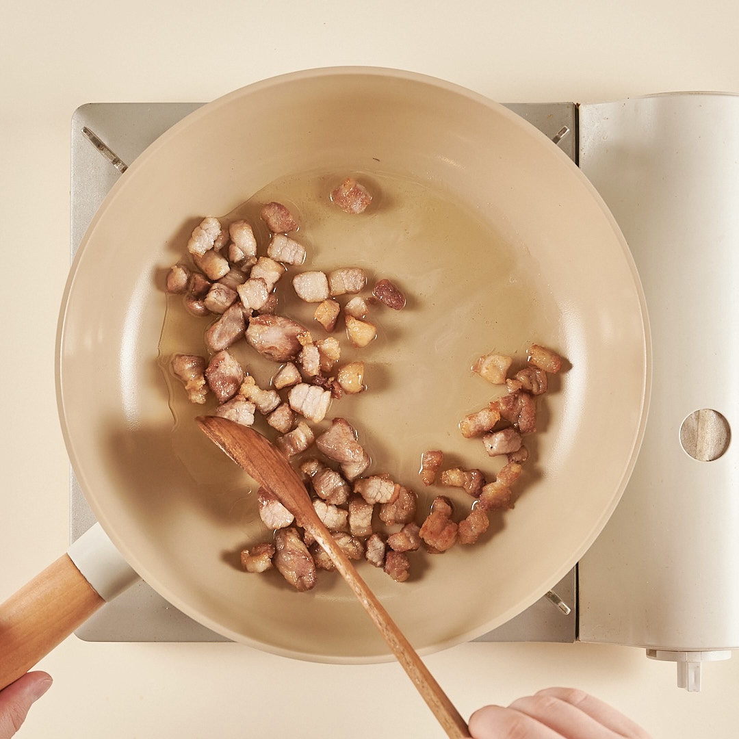 팬에 식용유를 두른 후, 중불에서 1분간 예열하고 돼지고기를 넣어 3분간 바삭하게 볶아 주세요.
