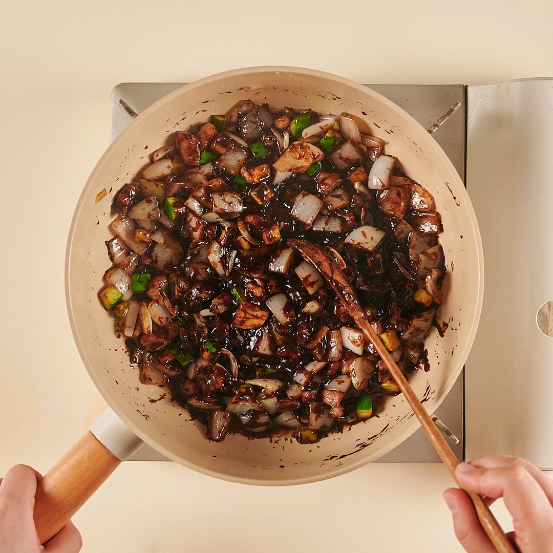 양파와 애호박, 특제짜장소스를 넣고 5분간 더 볶아주면 완성!