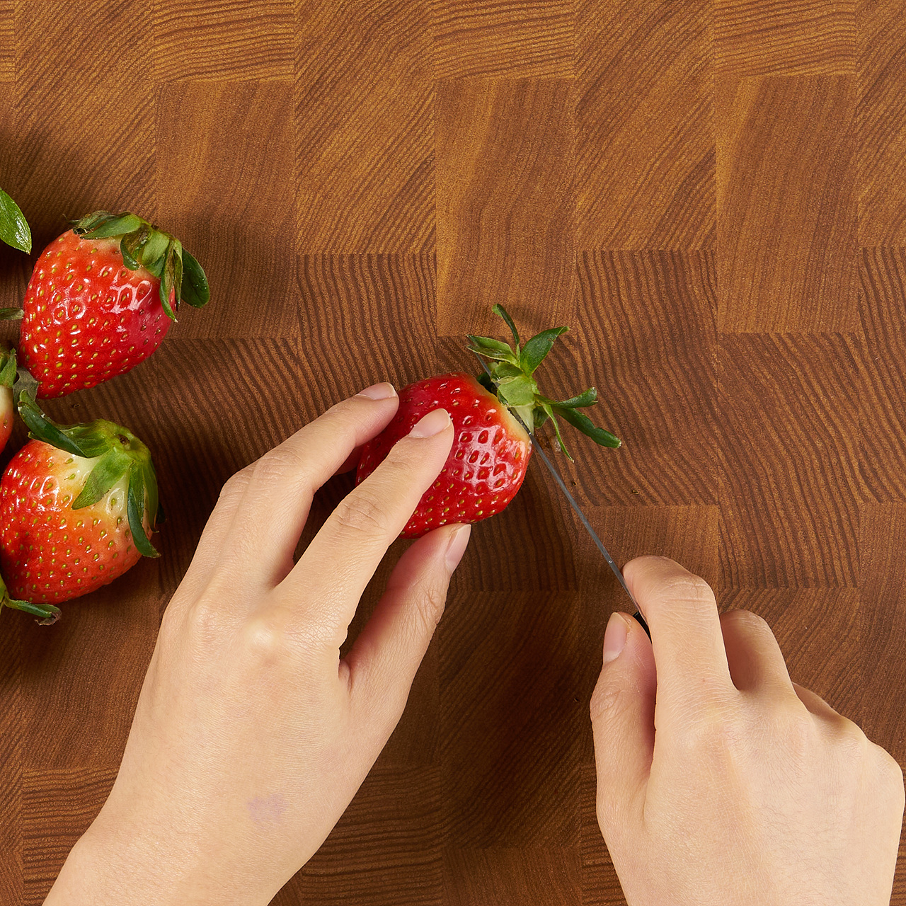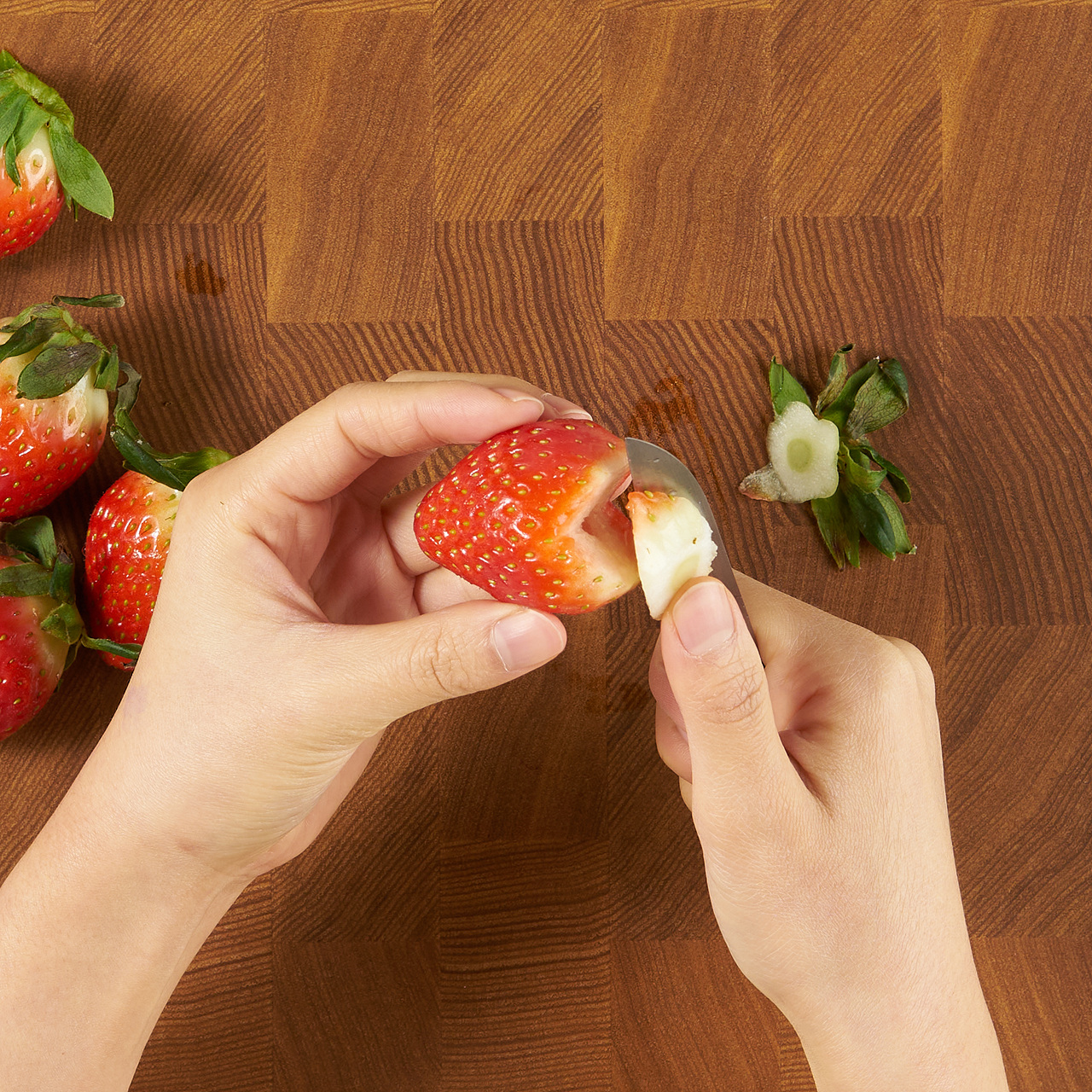 딸기는 씻어서 물기를 완전히 제거해 주세요. 꼭지 부분에 칼집을 넣고 v자로 파내 하트 모양을 만들어 주세요.