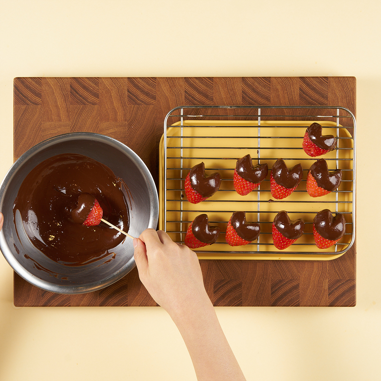 준비한 딸기의 뾰족한 부분(아래)에 얇은 꼬치를 꼽아 주세요. 꼬치 막대 부분을 잡고 녹인 초콜릿에 딸기를 담궈준 후, 식힘망 위에 올려 상온에서 굳혀 주세요.