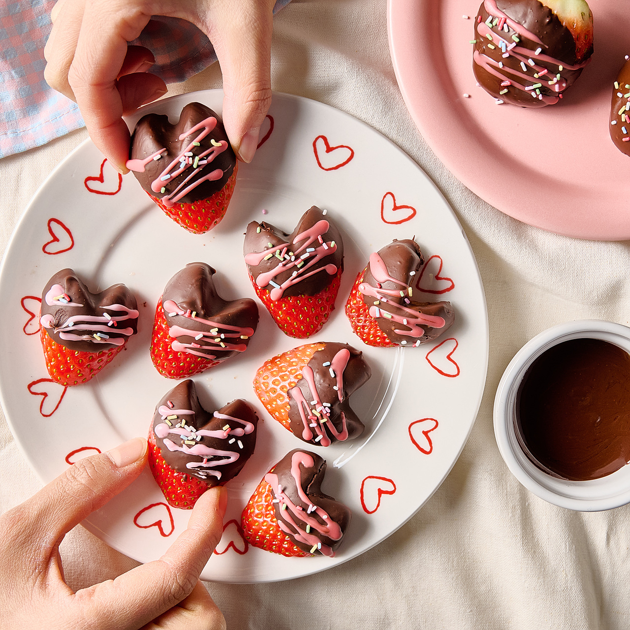 1. 하트 모양을 내지 않았을 경우, 딸기의 꼭지 부분을 잡고 초콜릿을 묻혀 주세요.