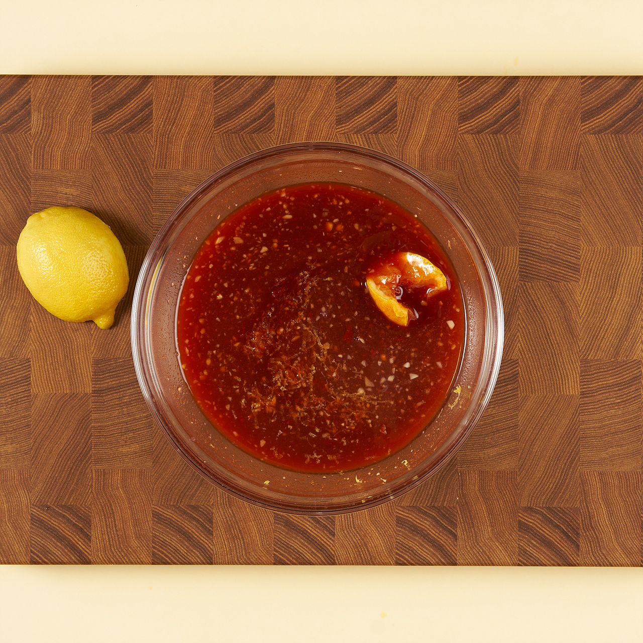 세척한 레몬의 껍질을 갈아 재료에 넣어 준 후, 레몬즙(1/4개)을 짜서 넣어 주세요. 과즙을 짠 레몬은 버리지 말고 초고추장에 함께 넣어 주세요.