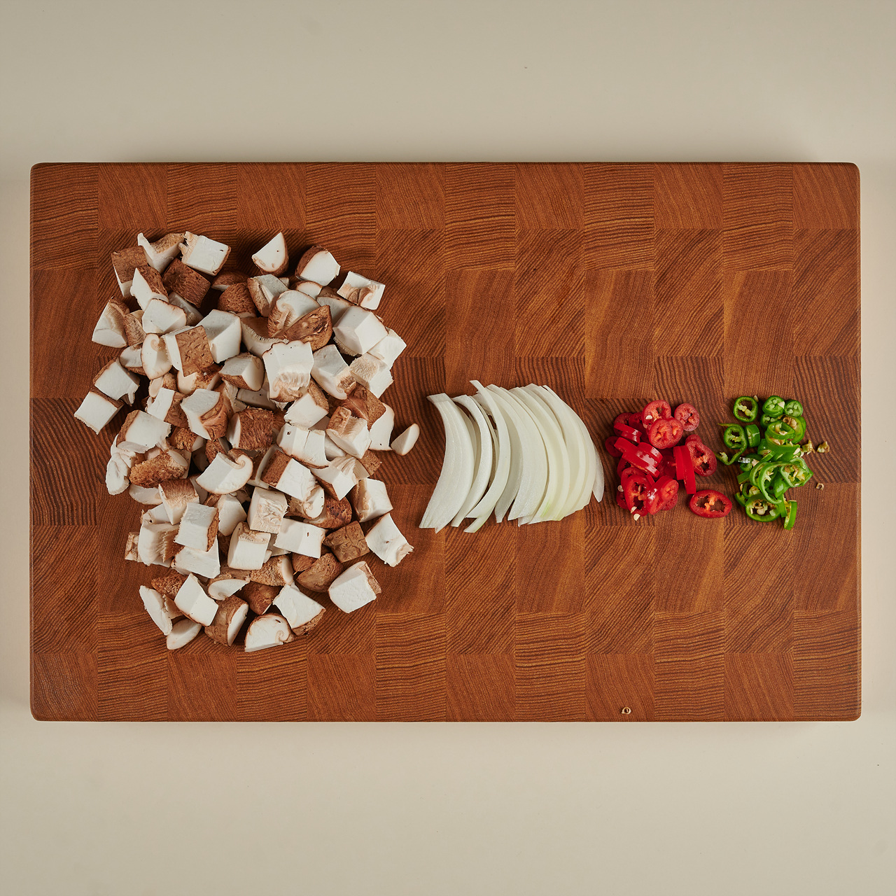 표고버섯은 밑동을 제거한 후, 사방 1cm 두께 주사위 모양으로 썰어주세요. 양파는 1cm 두께로 채 썰고, 청양고추와 홍고추는 1cm 두께로 송송 썰어 주세요.