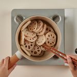 예열된 냄비에 식용유를 두른 후, 데친 연근을 넣어 중불에서 약 2분간 볶아 주세요.