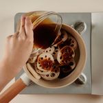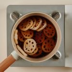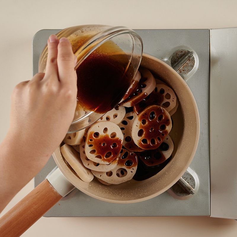 볶은 연근 위로, 양념재료(진간장, 설탕, 물엿, 물)를 넣어 센 불에서 끓여주다가 양념이 끓어오르면 불의 세기를 중불로 줄여 약 10분간 더 졸여주면 완성!