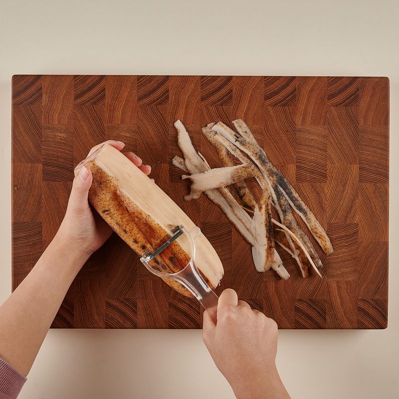 흐르는 물에 연근을 세척한 후, 필러를 사용해 껍질을 제거해 주세요. 원형 모양을 그대로 살리며 0.5cm 두께로 썰어주세요.