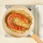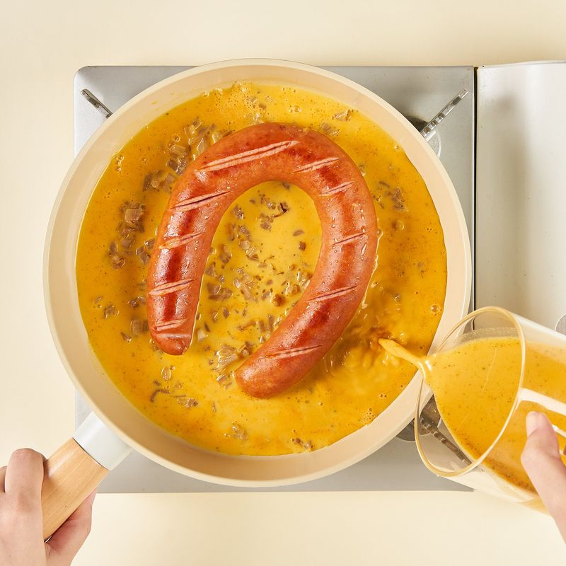 노릇노릇 소시지를 굽고 잘게 썰은 양파를 볶다가
