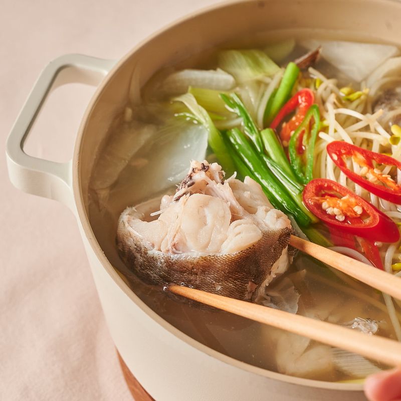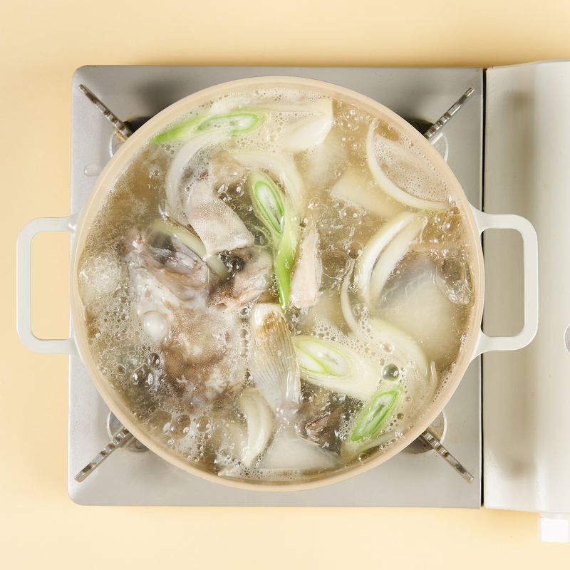 냄비에 물 2L와 무를 넣고 무가 익을 수 있도록 10분간 센불에서 끓여 주세요. 끓는 물에 연두순, 연두청양초, 으깬 마늘을 넣고 2분간 끓이다가 손질된 대구를 넣고 15~20분간 더 끓여 주세요.