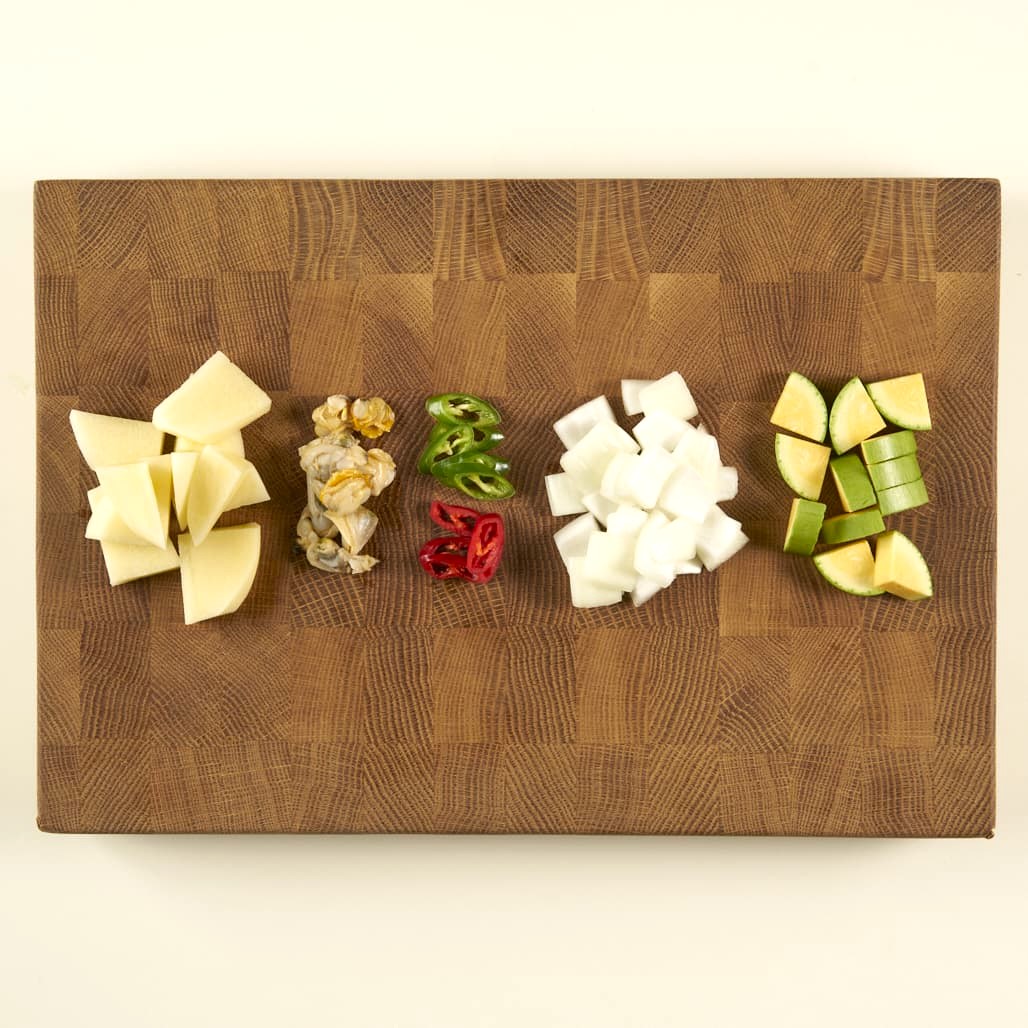 해감시킨 조갯살을 준비하고, 껍질 벗긴 감자와 애호박은 0.5cm두께로 은행잎 모양으로 썰어주세요. 양파는 2cm*2cm 크기로 썰고, 홍고추, 청양고추는 어슷 썰어주세요.