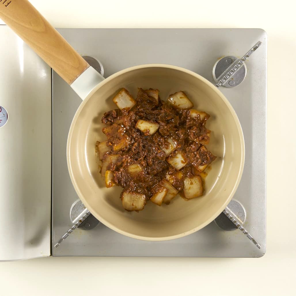 달궈진 냄비에 포도씨유를 두르고, 양파, 토장을 넣어 2분간 충분히 볶아주세요.