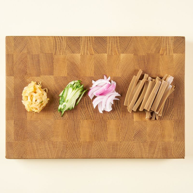 도토리묵은 길게 채 썰어 자르고, 오이와 적양파는 얇게 채 썰어주세요. 김치는 물에 헹궈 비슷한 크기로 채 썰어주세요.