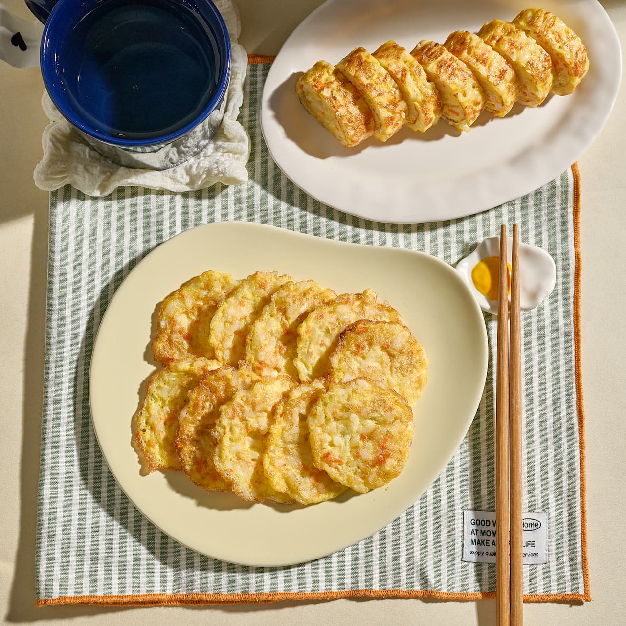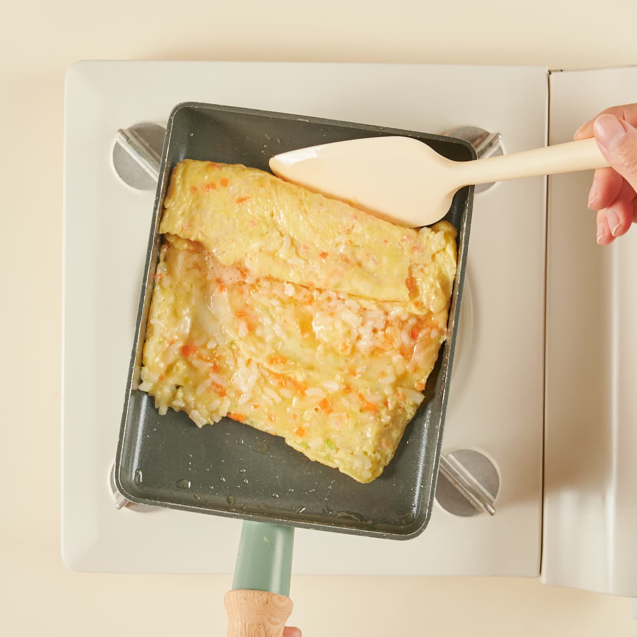 계란물에 냉털채소, 밥 넣어 한번에 부쳐봐요.