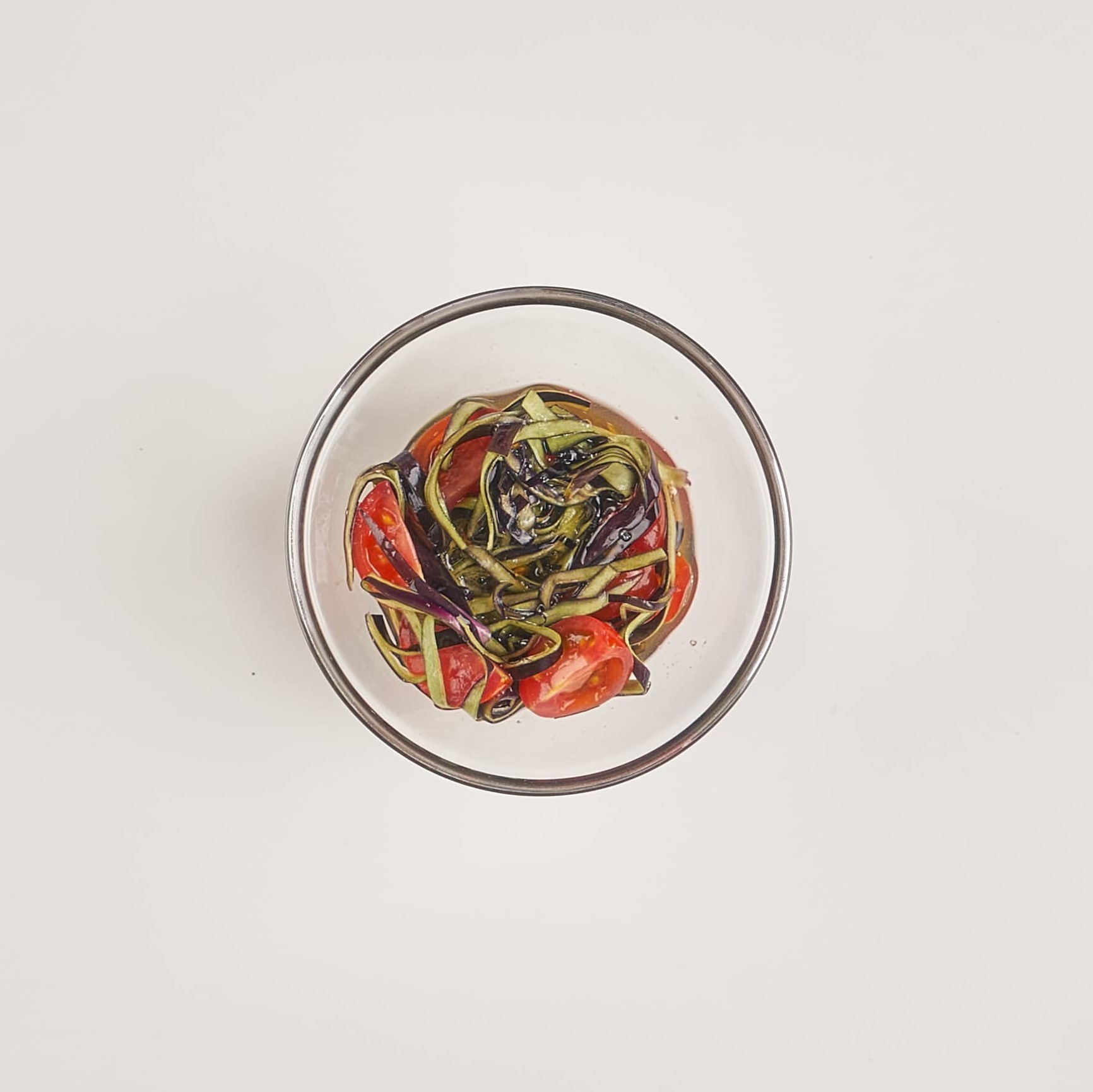 준비한 가지 껍질과 방울토마토, 연두순을 함께 버무려주세요.