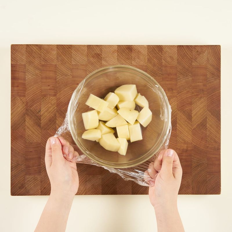 감자는 껍질을 제거하고 사방 2~3cm 크기로 듬성듬성 썰어주세요. 볼에 썰은 감자와 물 3스푼을 넣고 랩을 씌워 전자레인지에 10분 돌려주세요. (1,000W 기준)