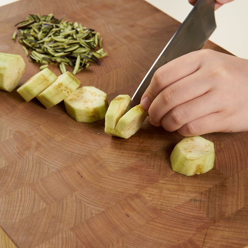 가지는 껍질을 제거한 후, 3cm 두께로 원형으로 썰어주세요. 썰은 가지 가운데 칼집을 내고, 가지 껍질은 길게 채 썰어 주세요.