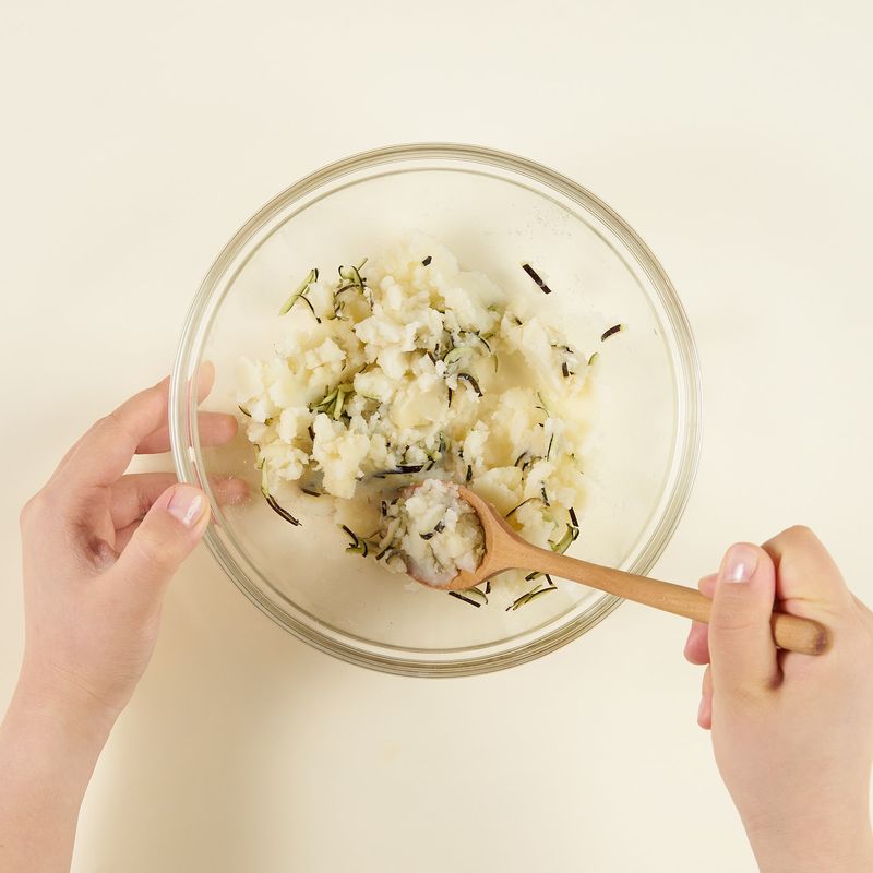 전자레인지로 조리한 감자를 포크로 으깨고, 연두순(1스푼)과 연두청양초(0.5스푼), 채 썬 가지껍질을 넣고 골고루 섞어 감자소를 만들어주세요.