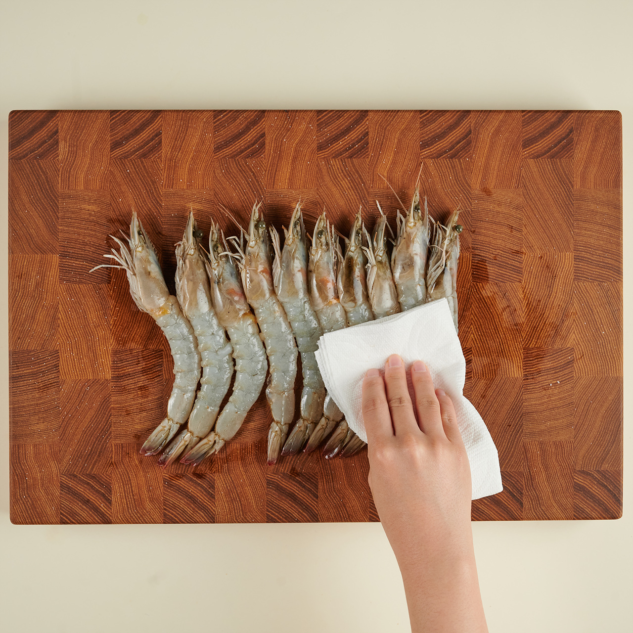 손질한 새우에 소금을 뿌려 밑간을 하고 겉에 올라온 수분을 키친타올로 잘 닦아주세요.