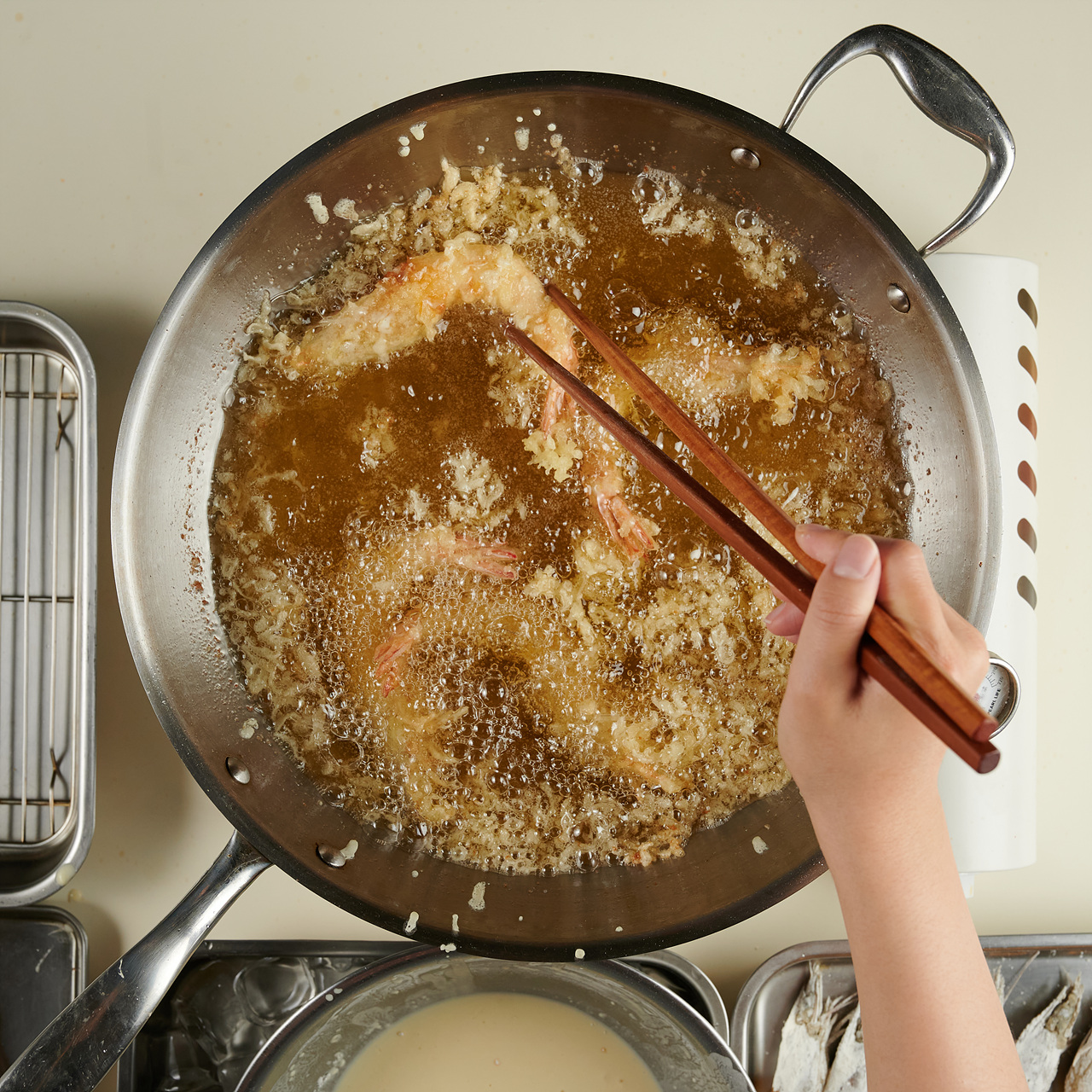1. 기름에 새우를 넣고 새우 위에 젓가락이나 손으로 반죽을 흩뿌려주면 새우 겉면에 튀김 꽃이 만들어지면서 더욱 바삭한 튀김을 만들 수 있어요.