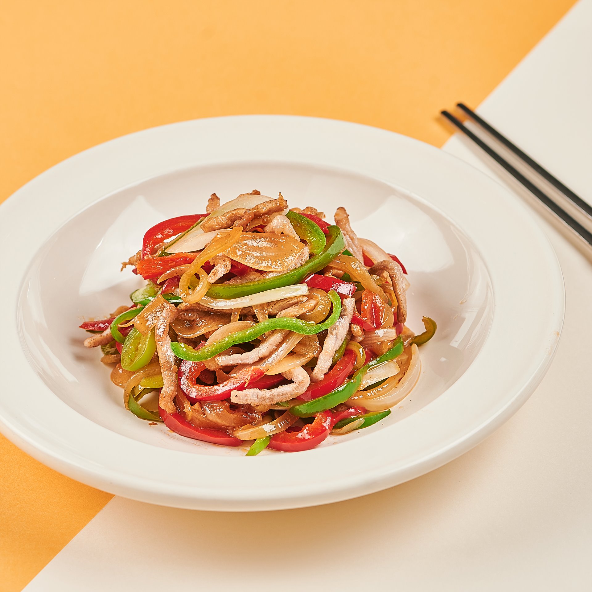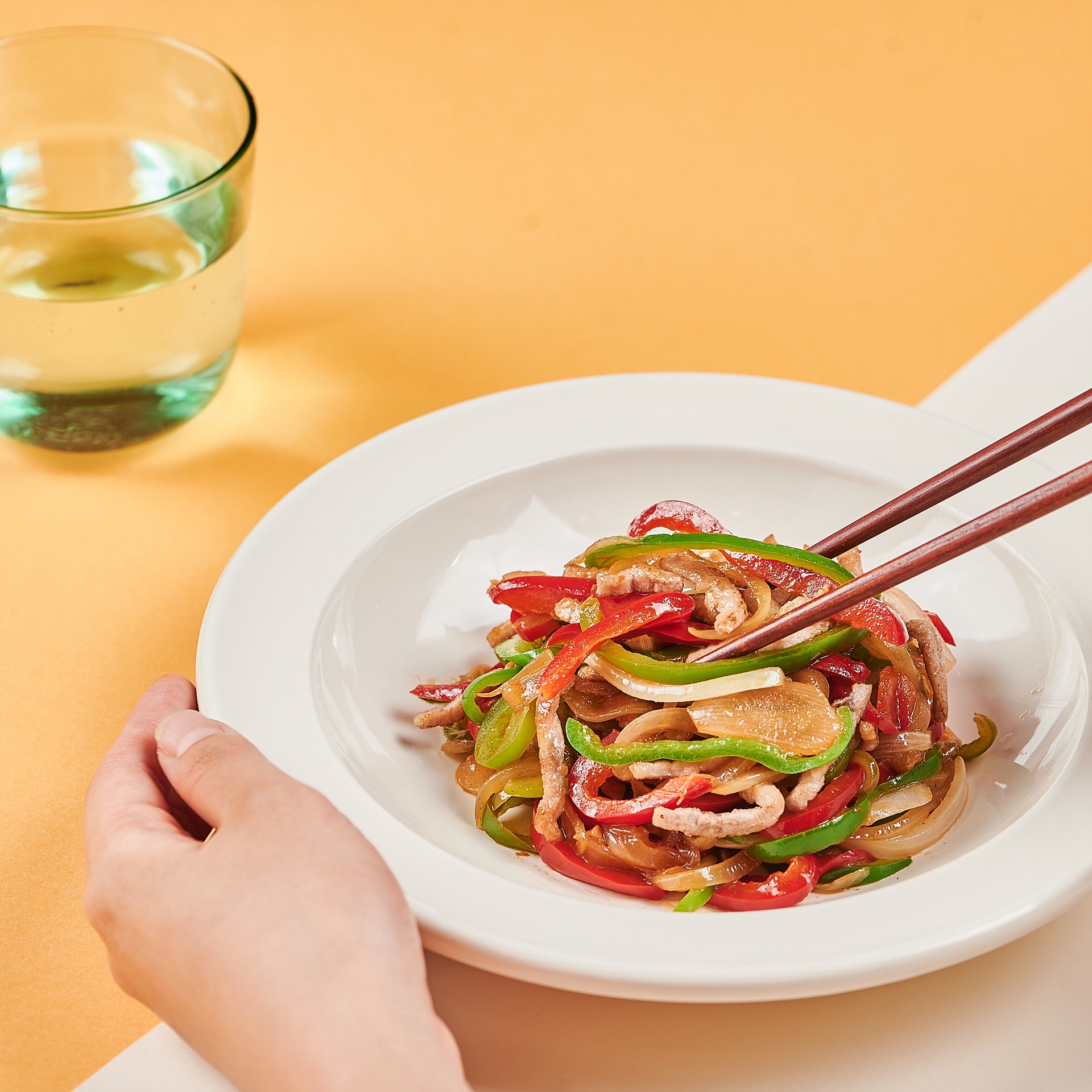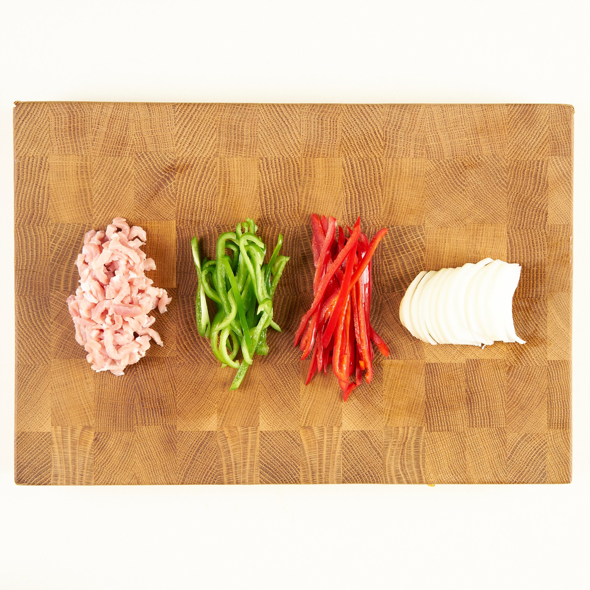 청피망과 홍피망은 꼭지와 씨를 제거해 채썰고, 양파도 채썰어 주세요.