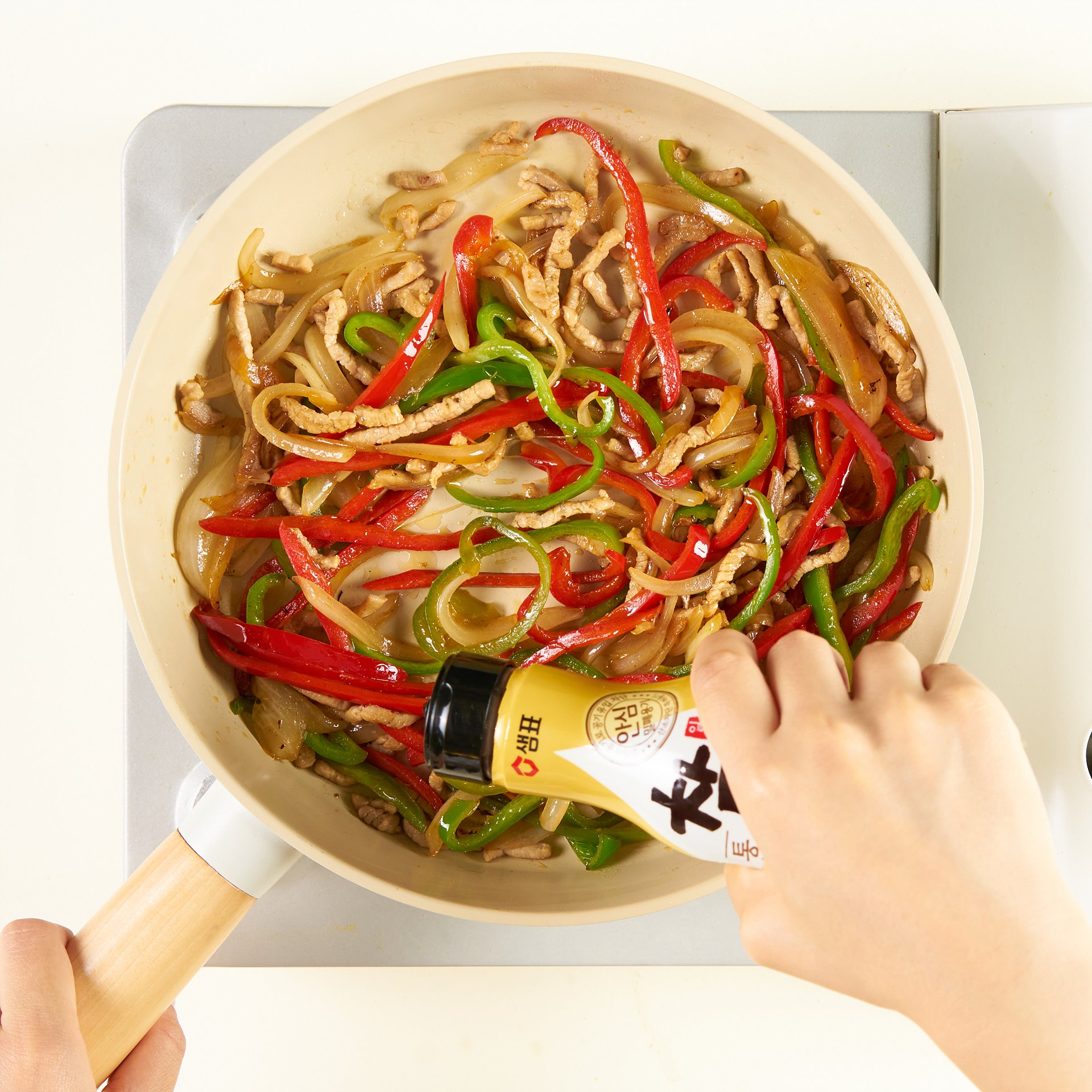 피망과 새미네 잡채소스를 넣어 2분간 중불에 더 볶아 주세요.불을 끄고 참기름을 뿌려주면 완성!