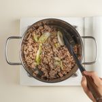 중강불로 예열한 냄비에 식용유를 두르고, 썰어둔 대파의 흰 부분만 넣어 약 1분간 볶아 파기름을 내 주세요. 파의 익은 향이 올라오면, 돼지고기를 넣고 표면이 갈색으로 변할 때까지 중강불에서 약 5분 볶아주세요.