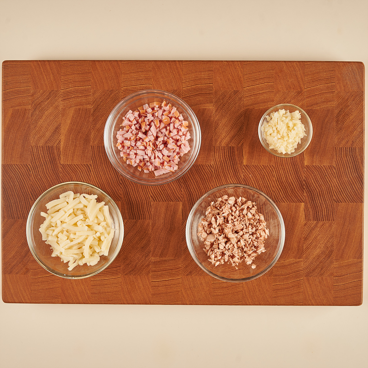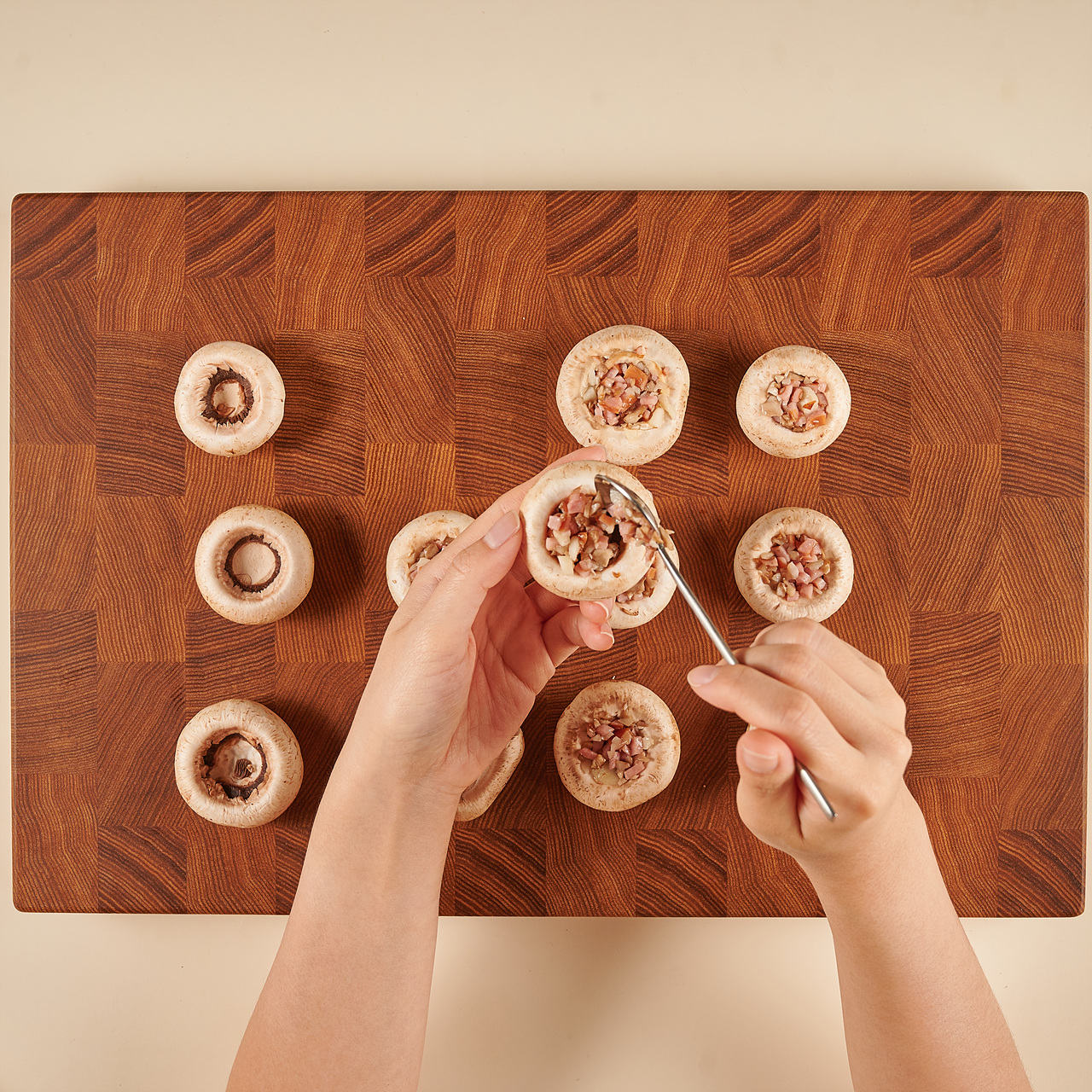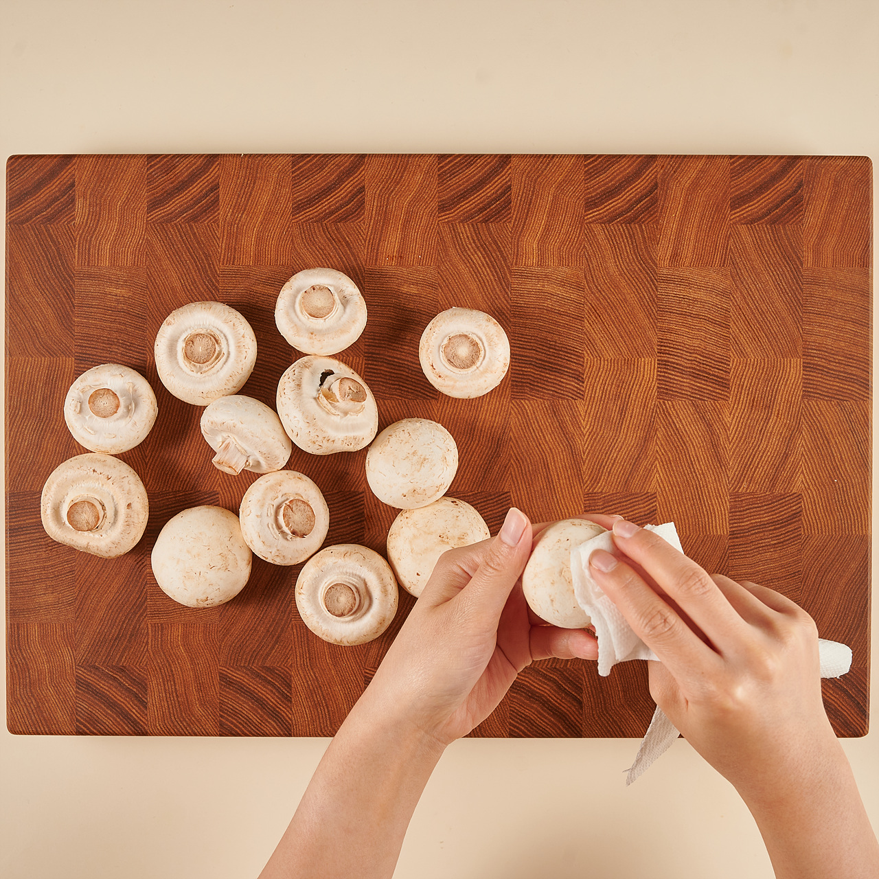 양송이는 젖은 행주로 겉을 닦거나 붓으로 먼지를 잘 털어주고, 줄기는 손으로 눌러 제거해 주세요. 양송이 줄기와 비엔나소시지를 잘게 다져주세요.
