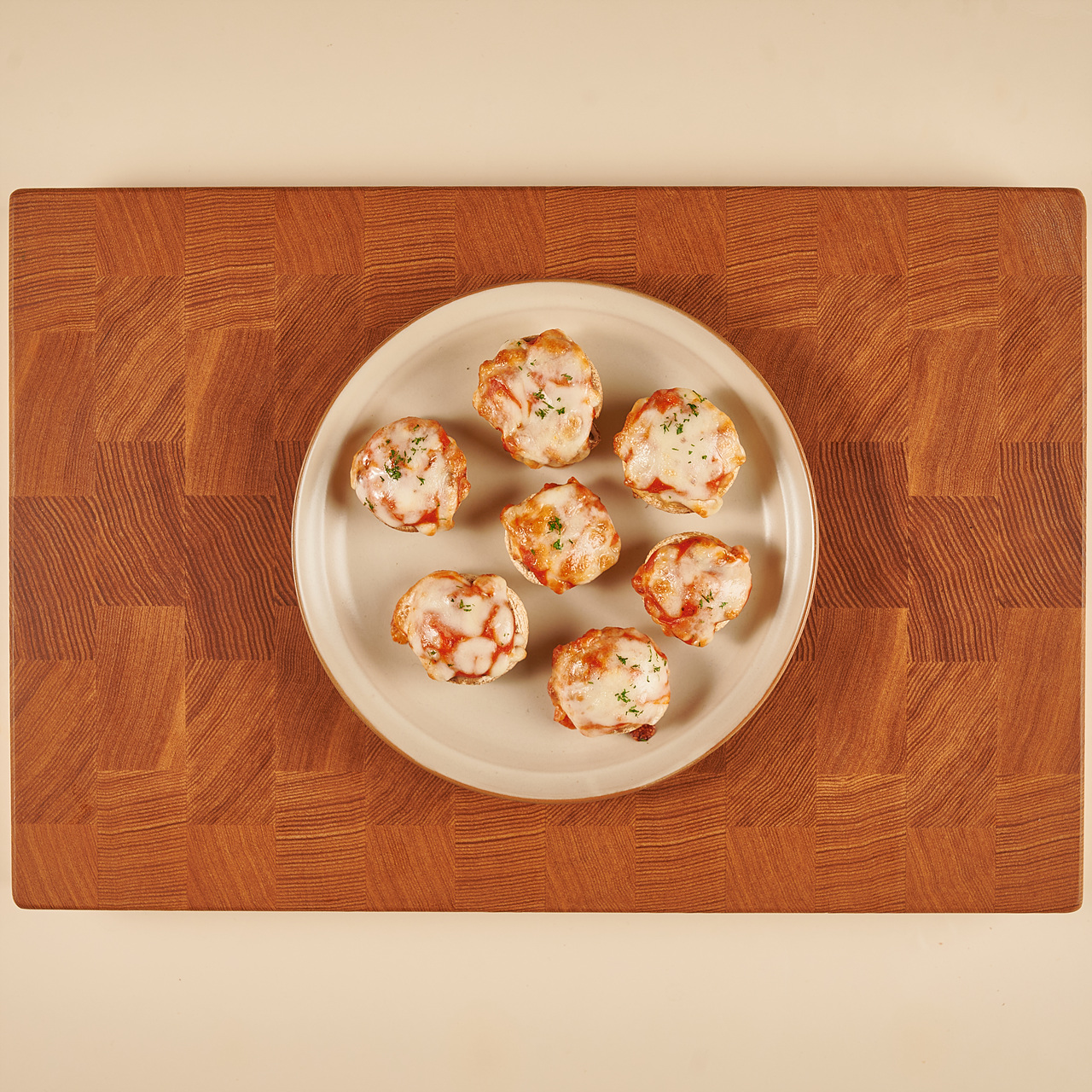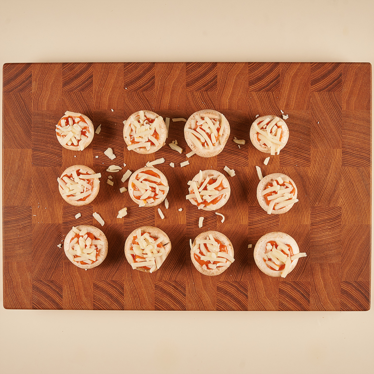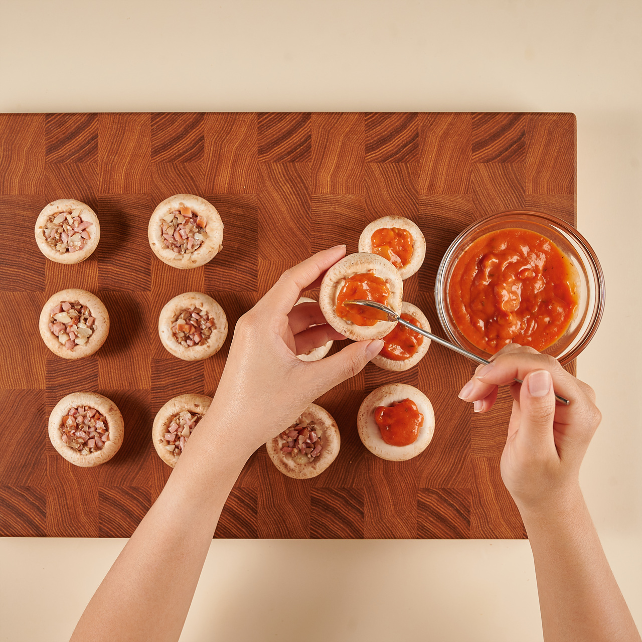 양송이버섯 안쪽으로 볶은 재료들을 채워 넣고 그 위에 파스타 소스와 피자치즈를 올려주세요.