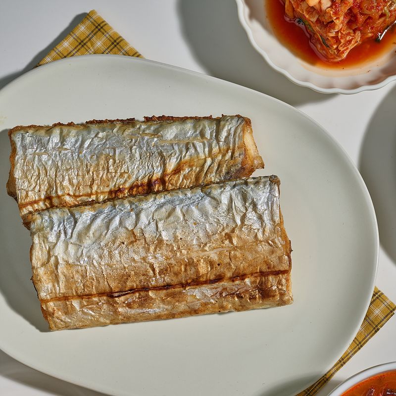 중불에서 30초간 예열한 팬에 식용유를 두르고, 갈치를 올려 1분마다 뒤집어가며 총 3분 정도 구워주면 완성!